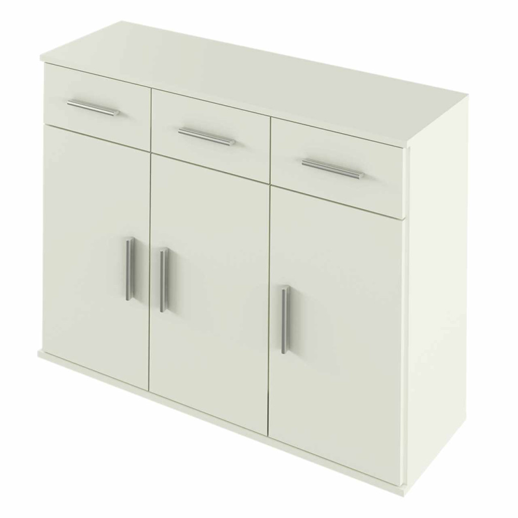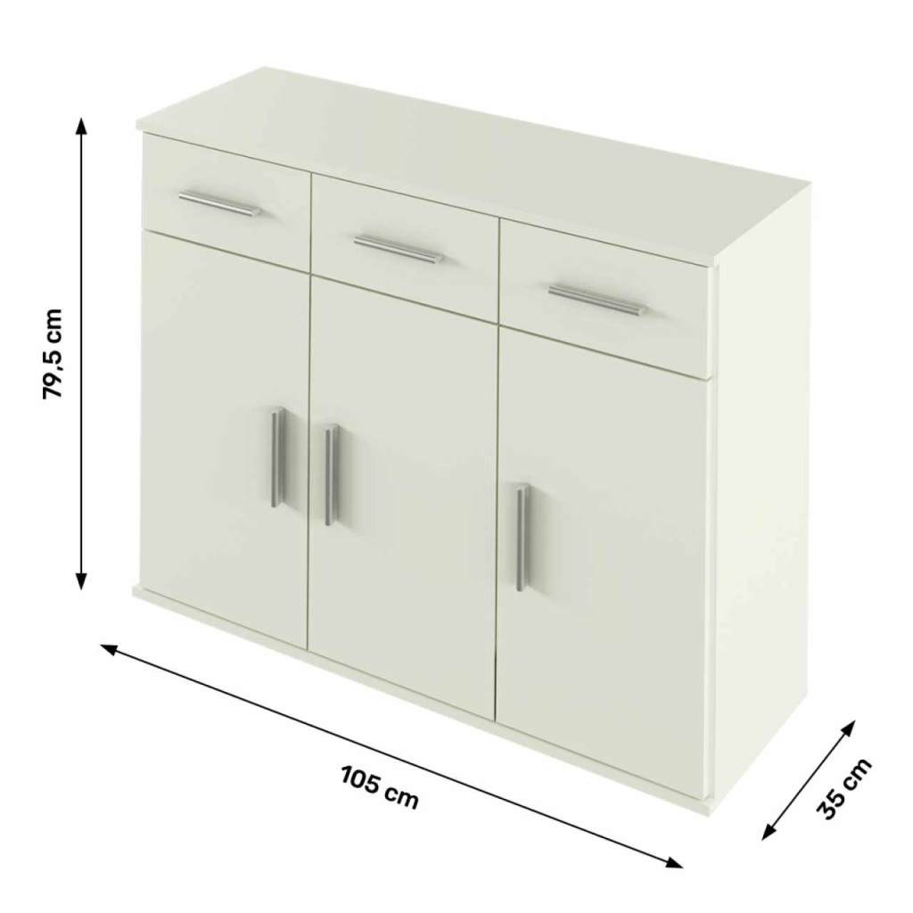 Anyag: laminált DTD Szín: fehér Méretek (SzxVxH): 105x35x79,5 cm Háromajtós Három kisszekrény Három fiók Fogantyúval Szétszerelve szállítva