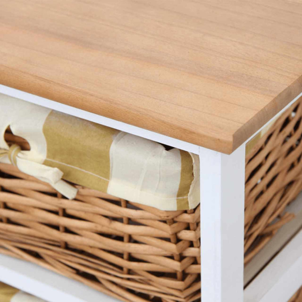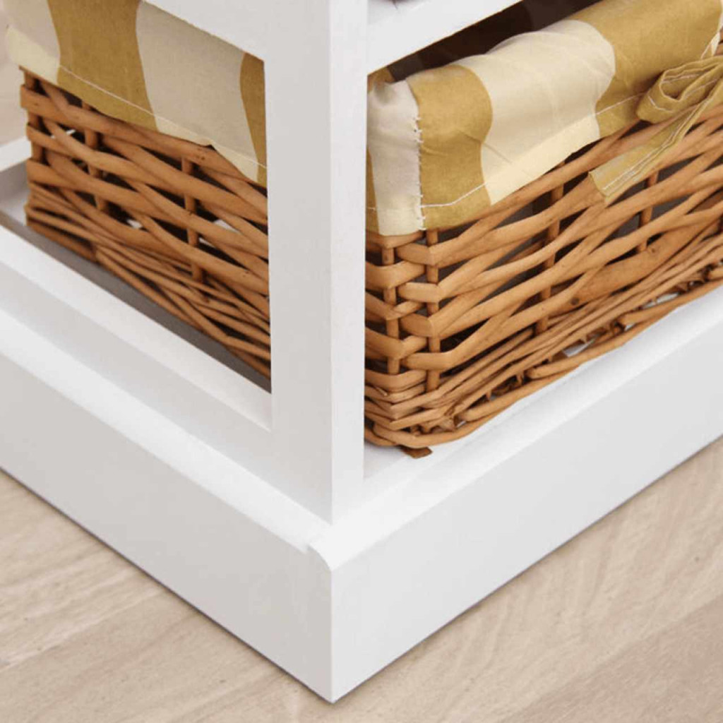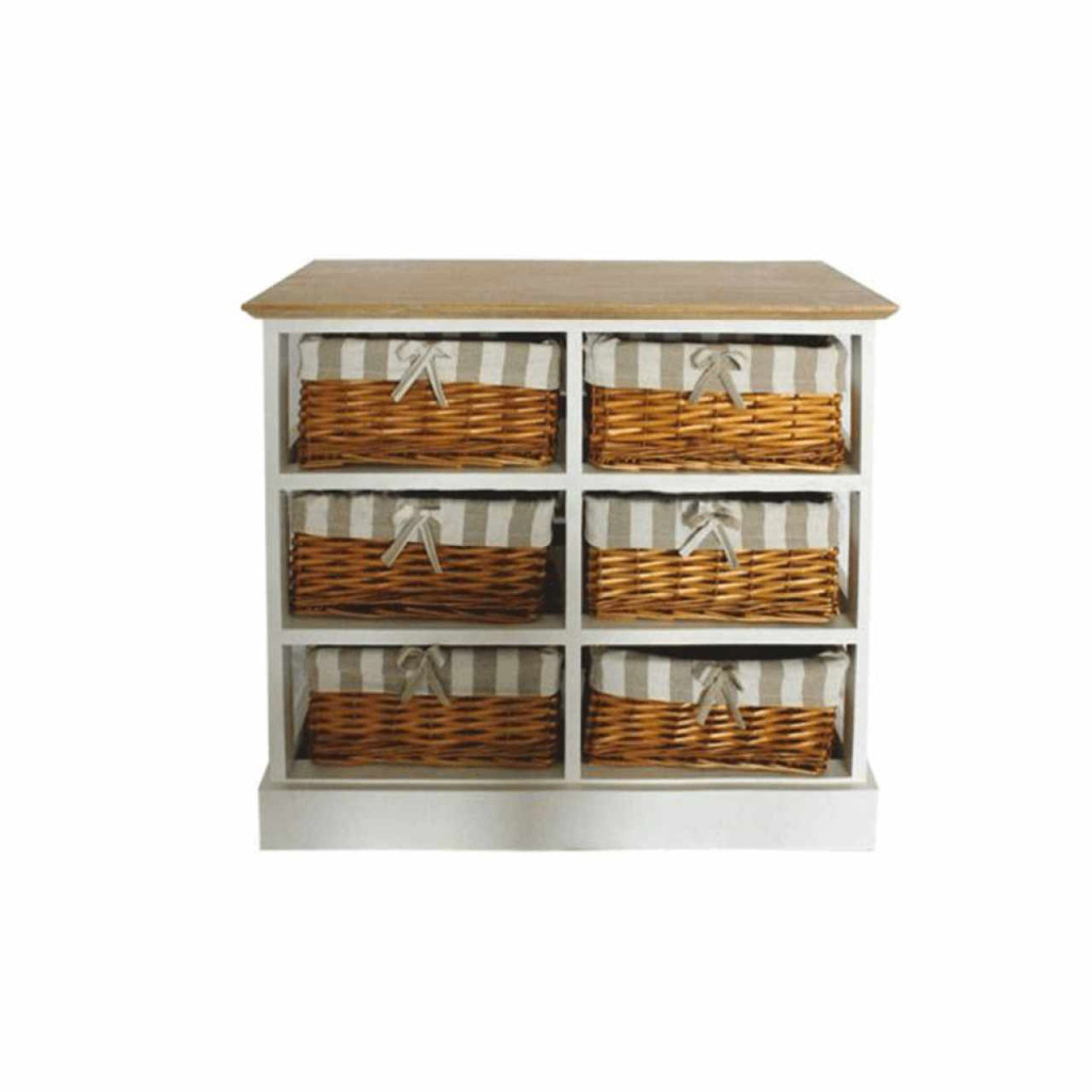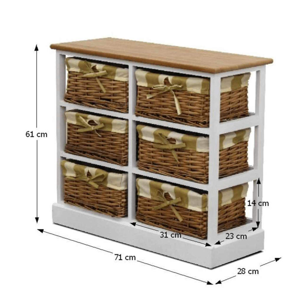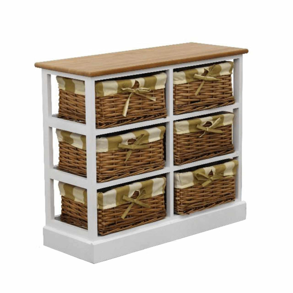 Komód GINGER 1, 6 fonott kosárral fehér és méz színkombinációbanAnyag: fa / vessző / szövetMéretek (SzéxMéxMa): 71x28x61 cmKosár mérete (SzéxMéxMa): 31x23x14 cmSzállítás összeszerelve