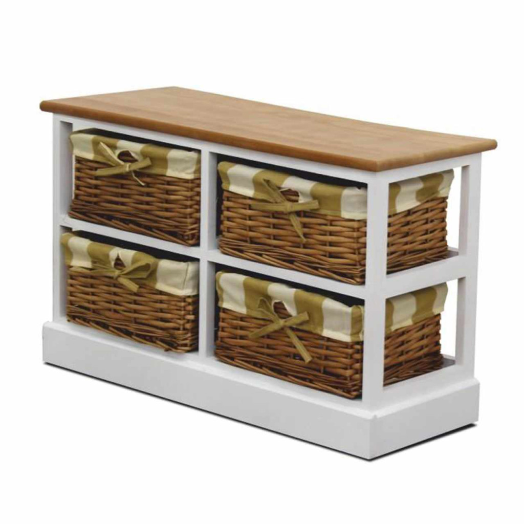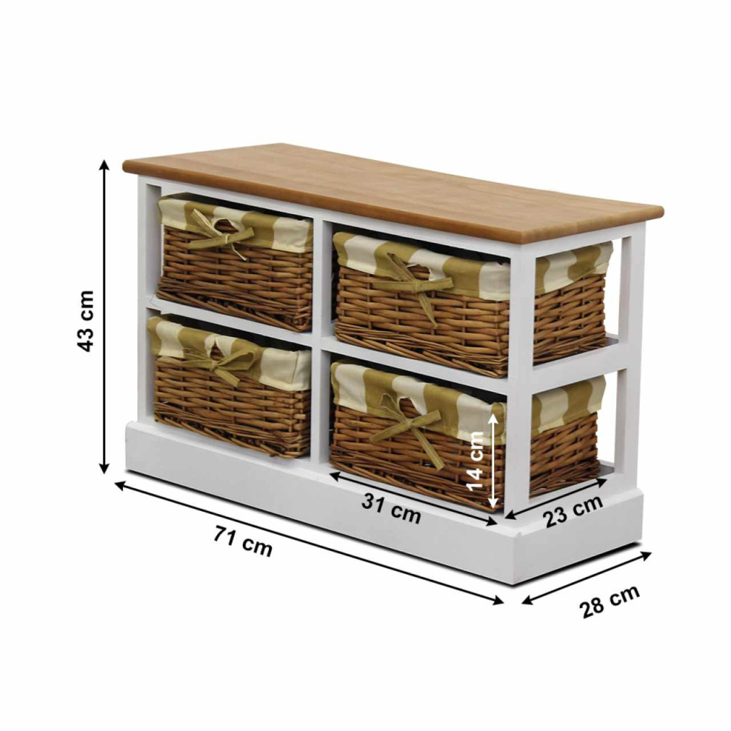 Komód GINGER 4 - 4 fonott kosárral fehér és mézes színváltozat kombinációjában, Anyag: fa/vesszőfonás/szövet Méretek (SzéxMéxMa): 71x28x43 cm Kosár mérete (SzéxMéxMa): 31x23x14 cmÖsszeszerelve szállítjuk