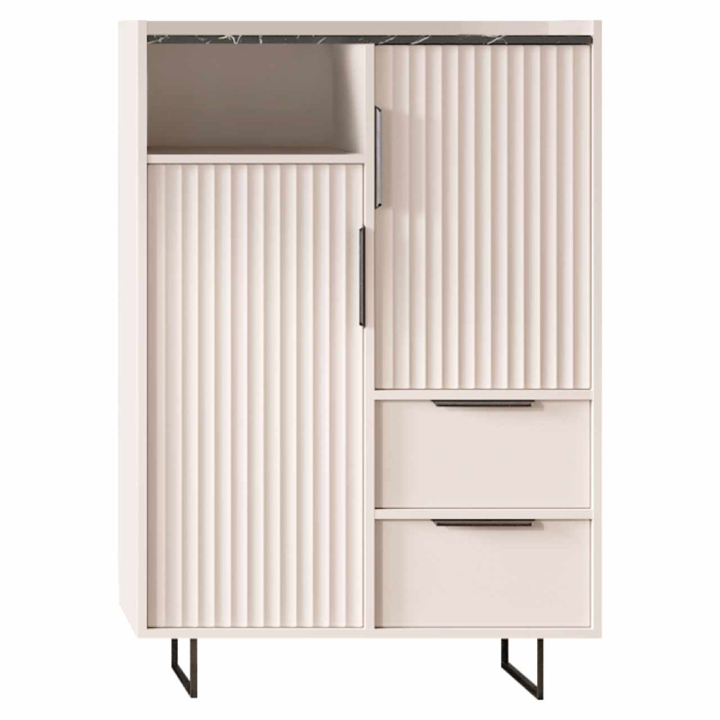Anyag: laminált DTD/fóliázott MDFSzín: kasmír/fekete márványMéretek (SzxMéxMa): 85x42x125 cmAnyagvastagság: 1,6 cmKétajtósKét fiókKét szekrényNyitott tárhelyPolcosPolc teherbírása: 4 kgFiókok teherbírása: 2 kgFelső lap teherbírása: 15 kgFogantyúkkalFogantyúk anyaga: fémFogantyúk színe: feketeLábakonLábak anyaga: fémLábak színe: feketeLábak magassága: 12 cmDekoratív ajtókÉlek: hőre keményedő polimerekkel bevont papírDTD vastagsága - hátlap/fiókok alja: 0,3 cmHátlap/fiókok aljának színe: fehérTeljesen kihúzható golyós sínZsanérokModern dizájnFalhoz rögzítés ajánlottSzétszerelve szállítva