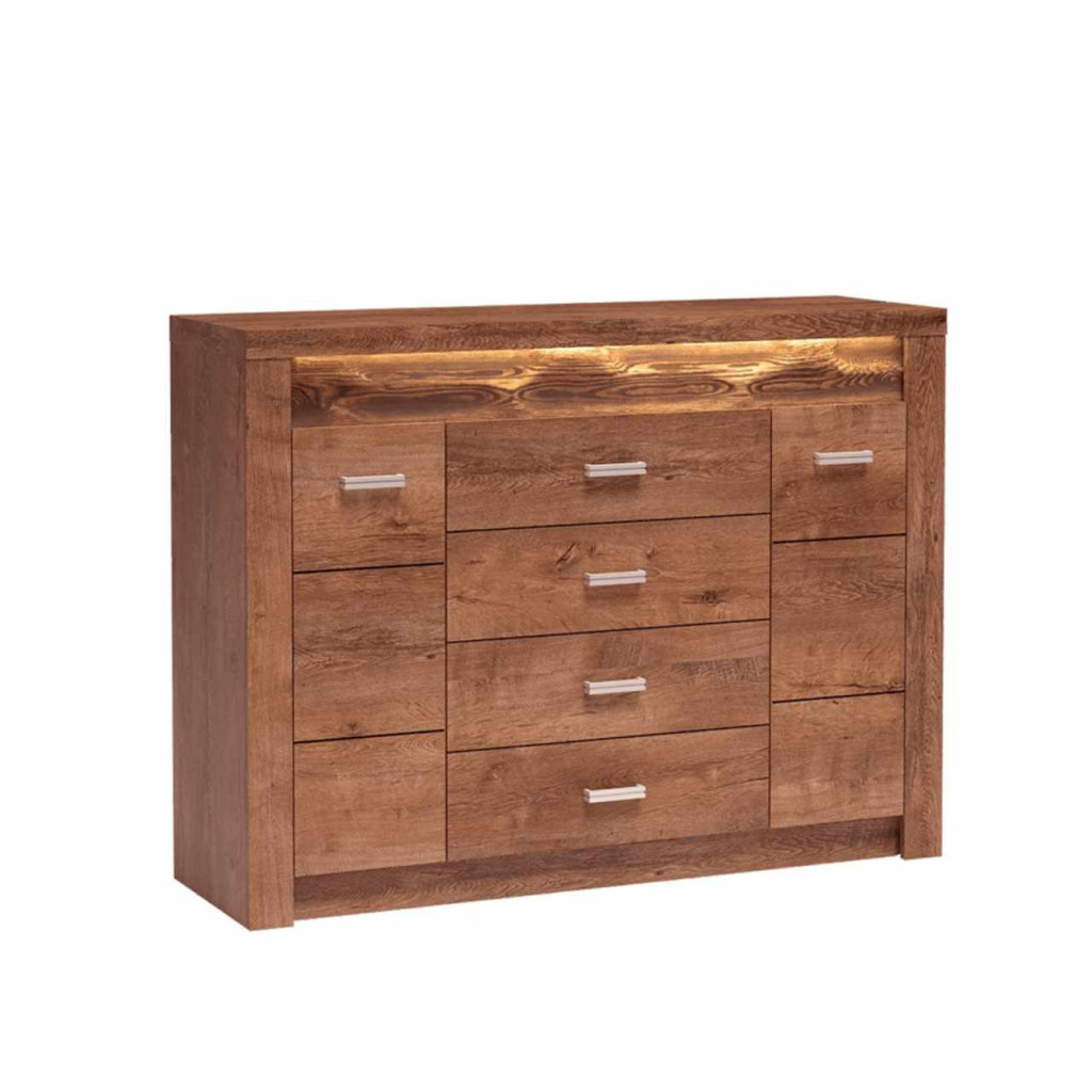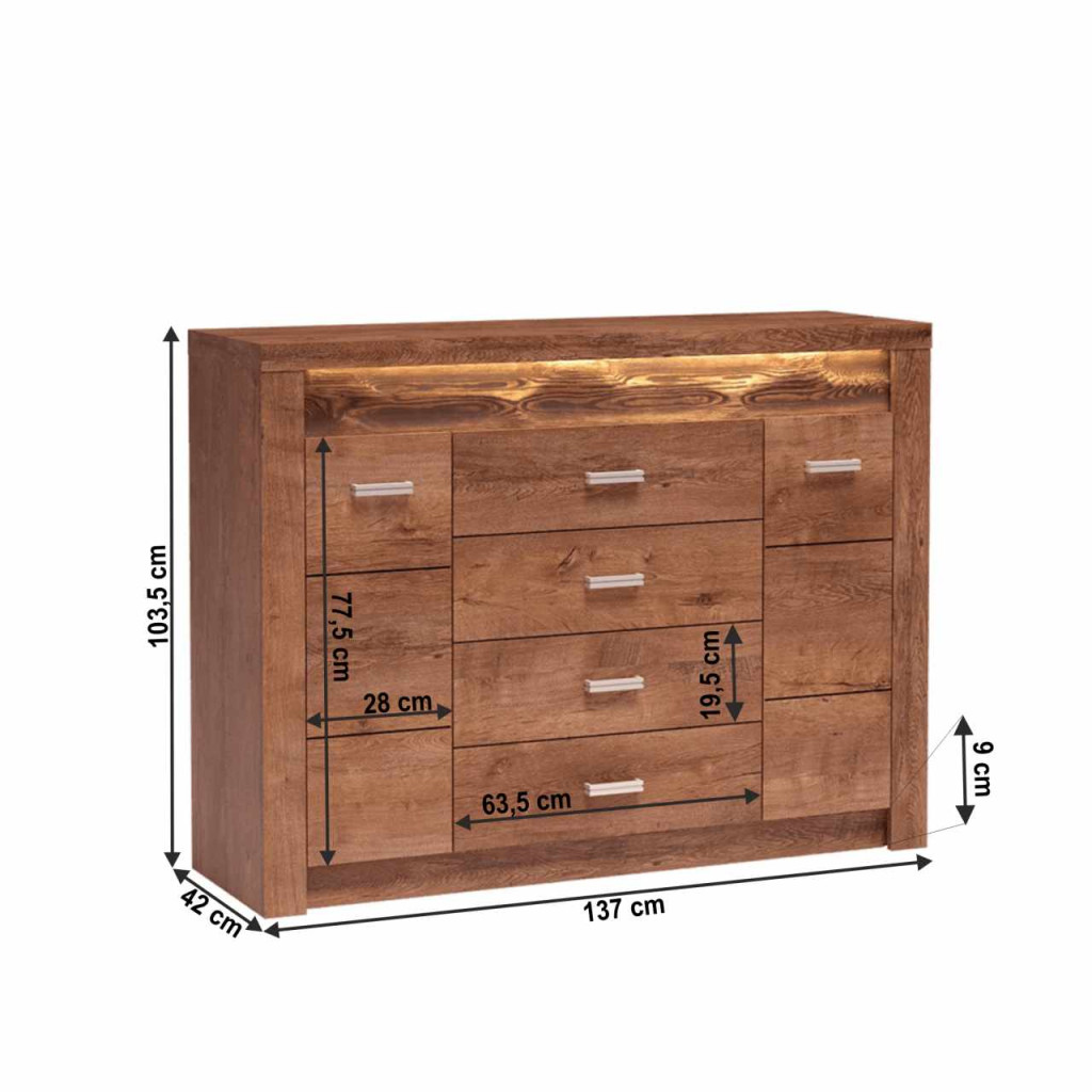 Komód 07 luxus elemes bútor kínálatunkból. Váz vastagsága: 48 mm, fém fogantyúk Anyag: laminált DTD, ABS élek Színváltozat: világos kőris Méretek (SzéxMéxMa): 137x42x103,5 cm Megvilágított léc masszív fából Szállítás LED világítás nélkül LED világítás hozzárendelhető Szétszerelt állapotban szállítjuk