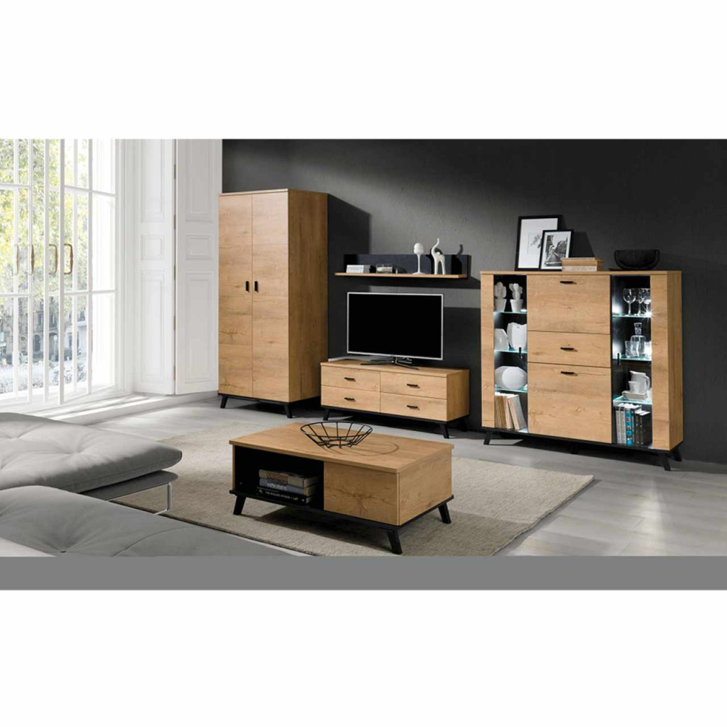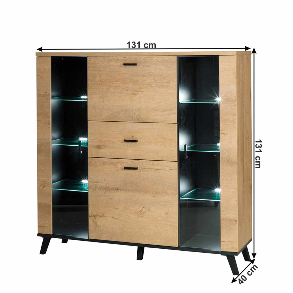 Anyag: laminált DTD/műanyag Szín: tölgyfa lefkas/fekete Méretek (SzxVxH): 131x40x131 cm Alsó tér magassága a padlótól: 12 cm Tárolóhely lehetőség Két üveg vitrin ABS élek Műanyag lábak Modern stílus LED világítás nélkül szállítva LED világítás hozzárendelhető Bontásban szállítva