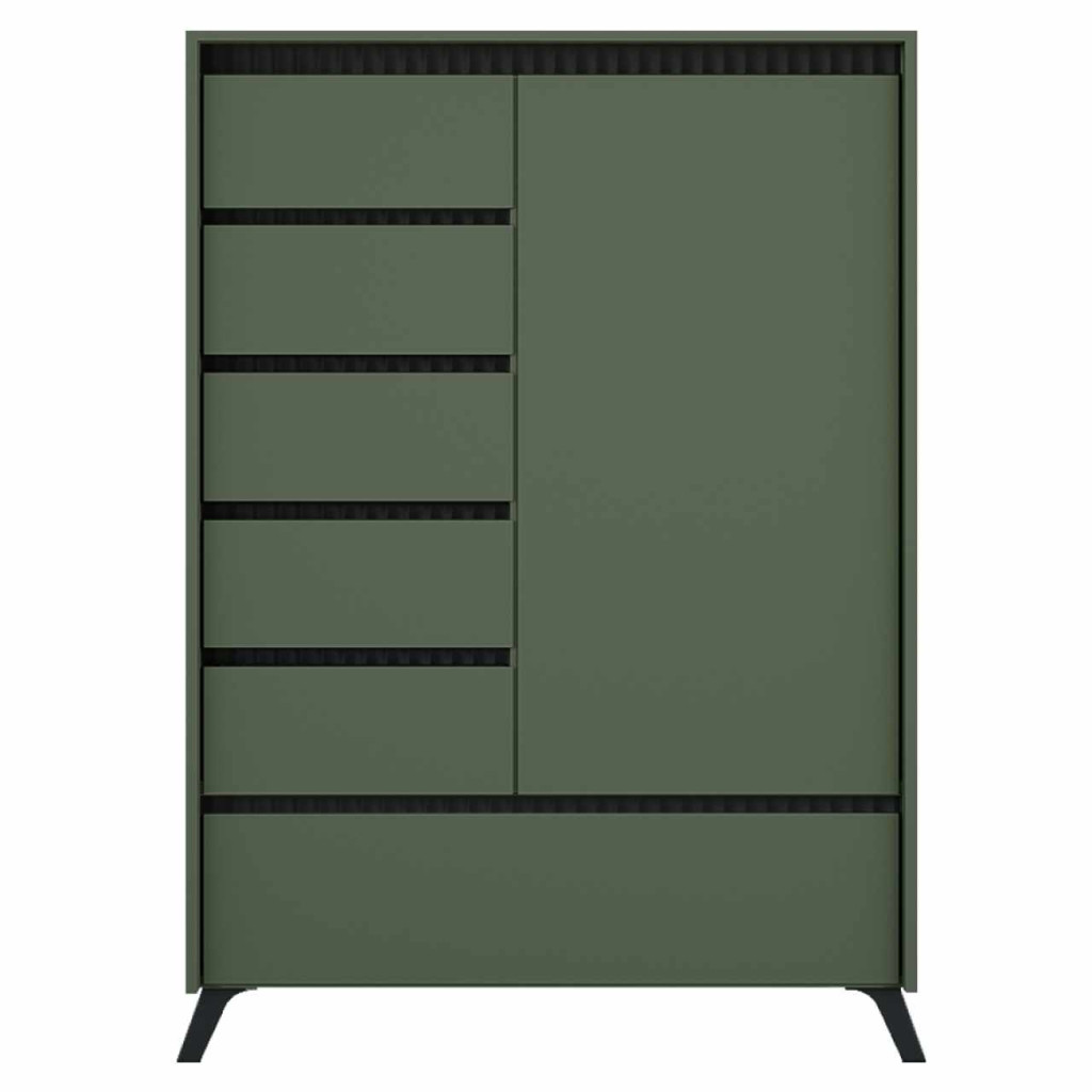 Anyag: laminált DTD/fóliázott MDF/PVC fóliaSzín: smoke zöld/feketeMéretek (SzxMéxMa): 95x45x152,5 cmAnyagvastagság: 1,6-1,9 cmEgyajtósBillentős szekrényÖt fiókPolcokLábakonLábak színe: feketeLábak magassága: 12 cmTeljesen kihúzható golyós sínZsanérokÉl: hőre keményedő polimerekkel impregnált papír/PVCABS anyagvastagsága: 0,5 mmA farostlemez vastagsága - hátlap/fiókok alja: 0,3 cmHátlap/fiókok aljának színe: sötét milánói tölgyDekoratív marásFogantyú nélkülModern dizájnSzétszerelve szállítva