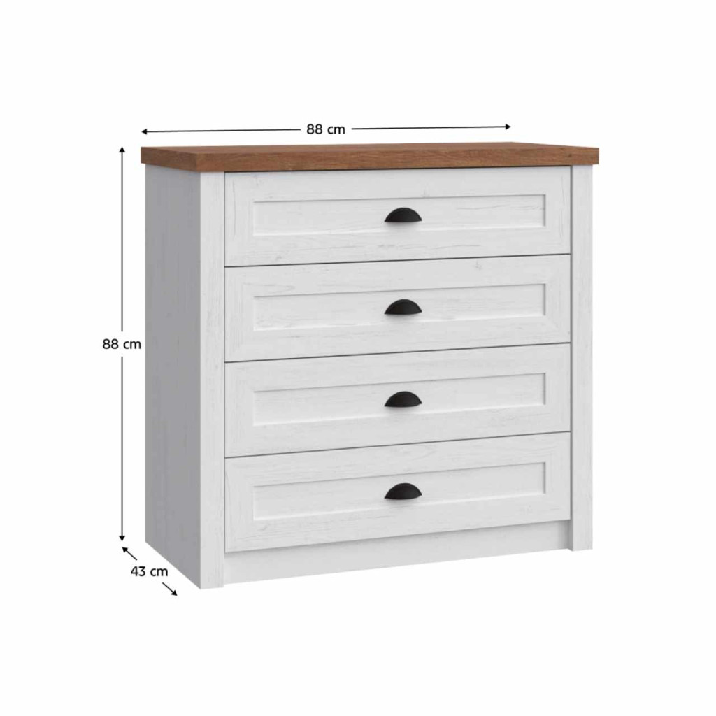 Anyag: laminált DTD Szín: sosna andersen/tölgyfa lefkas Méretek (SzxVxH): 88x43x88 cm Korpusz vastagsága: 15 mm A felső lemez vastagsága: 22 mm Fiókokkal 4 fiók Szétszerelve szállítva.