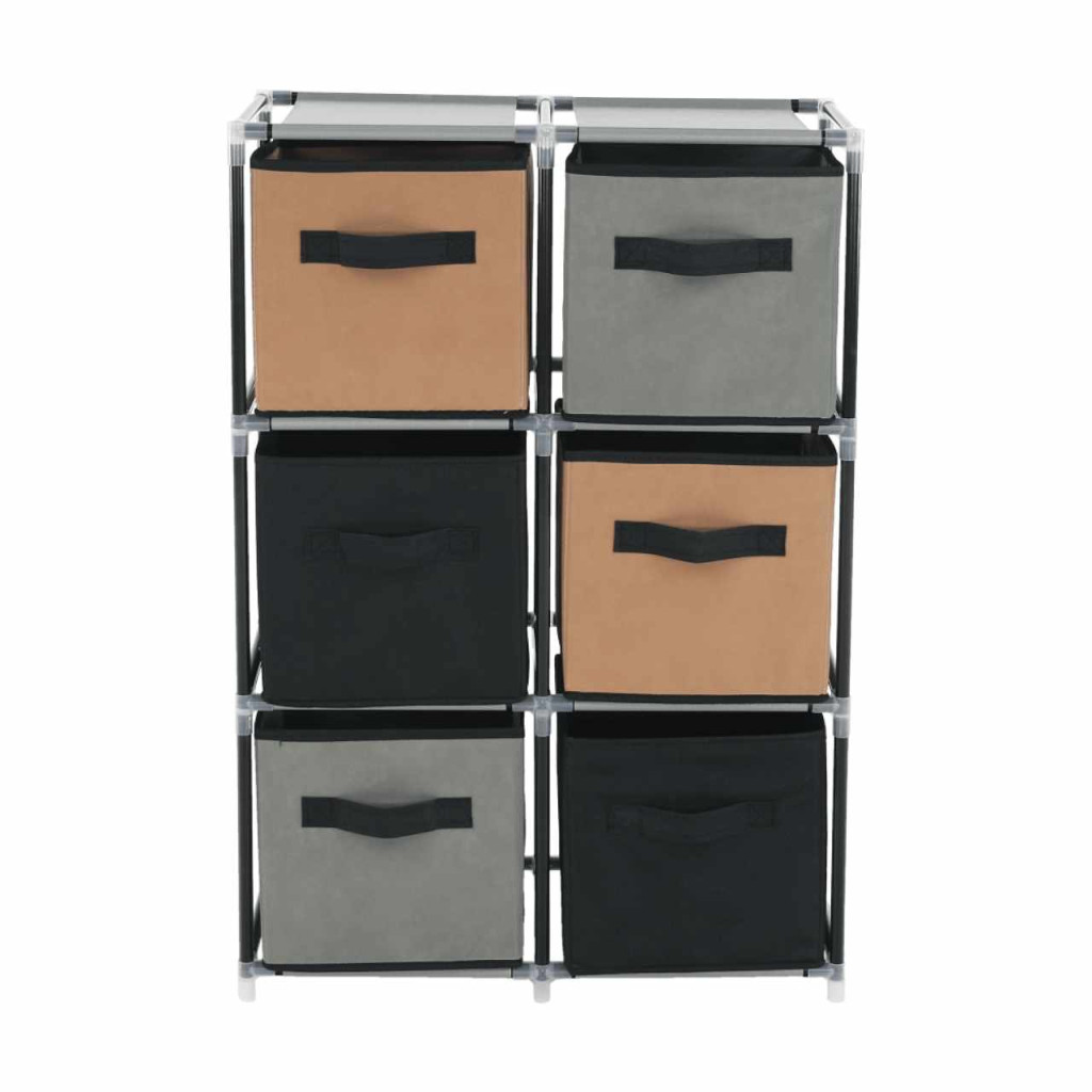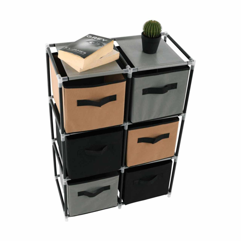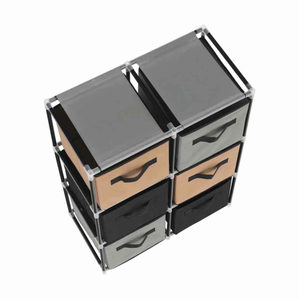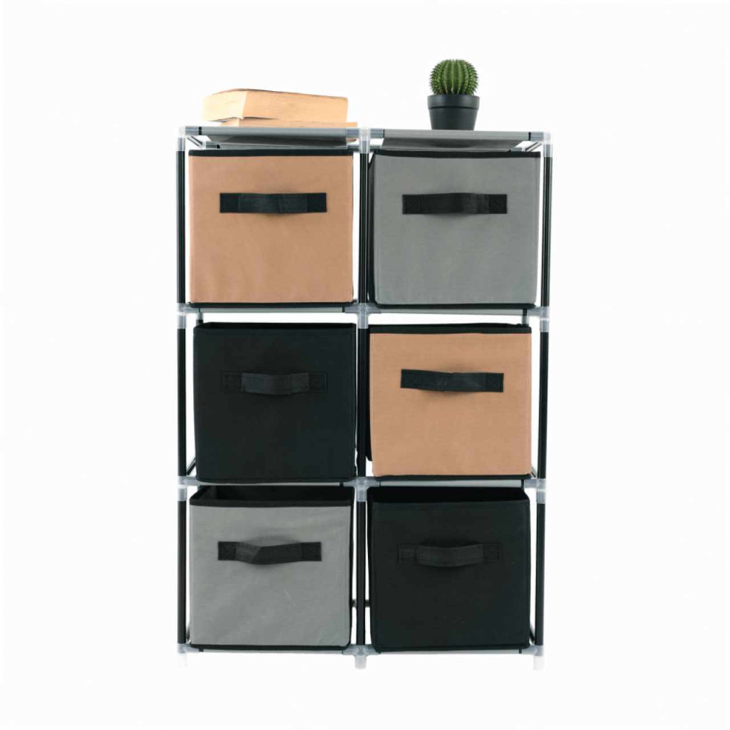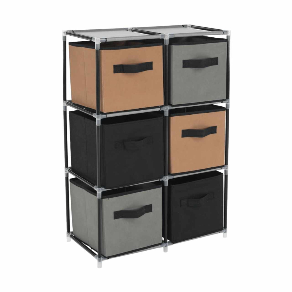 Szerkezet anyaga: fém Szín: fekete Anyag fiókok: szövet Szín: barna/szürke Kötőelemek anyaga: műanyag Méretek (SzxMéxMa): 58x30x83,5 cm Hat fiókkal Praktikus Fém szerkezet Szövet fiókok Fogantyúkkal Műanyag kötőelemek Egyszerű összeszerelés Többféle módon összerakható Szétszerelve szállítjuk