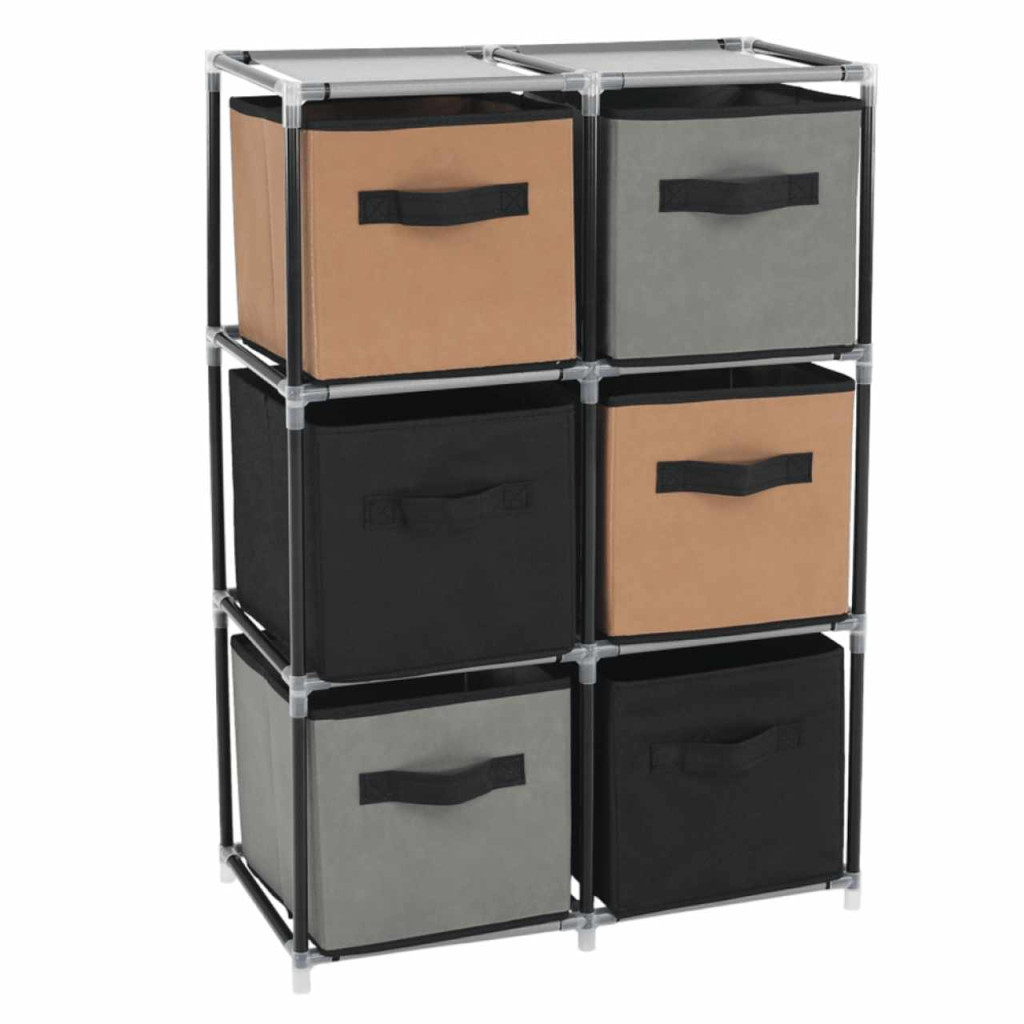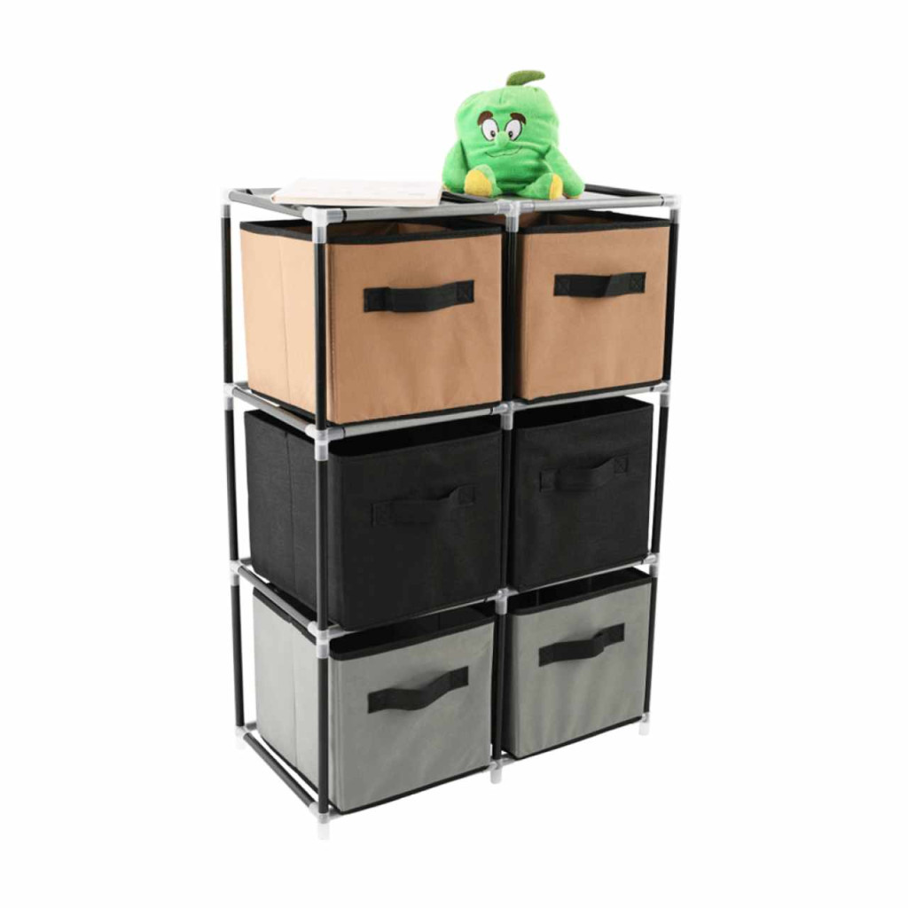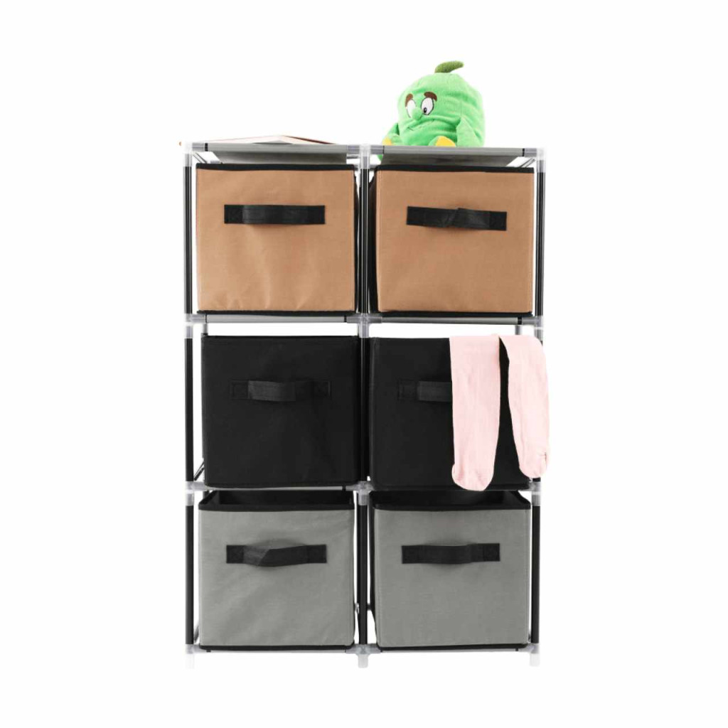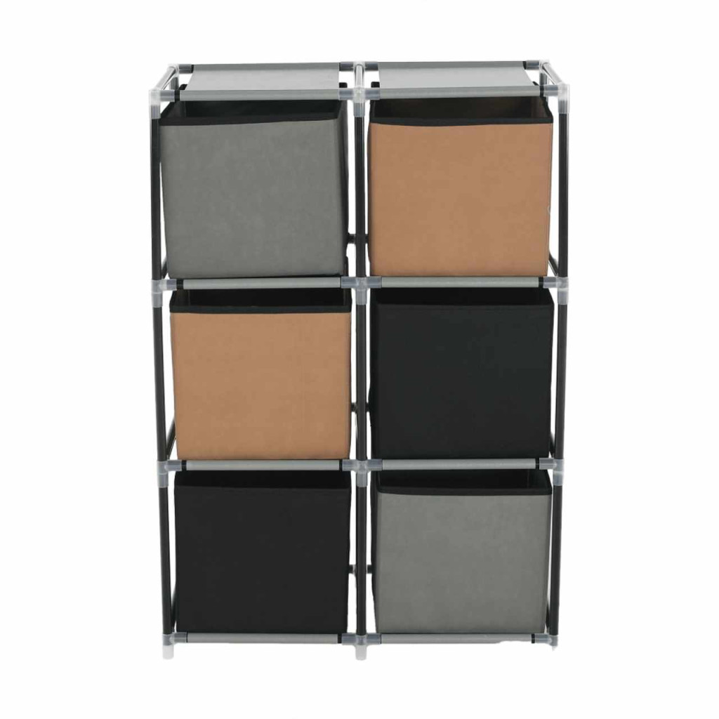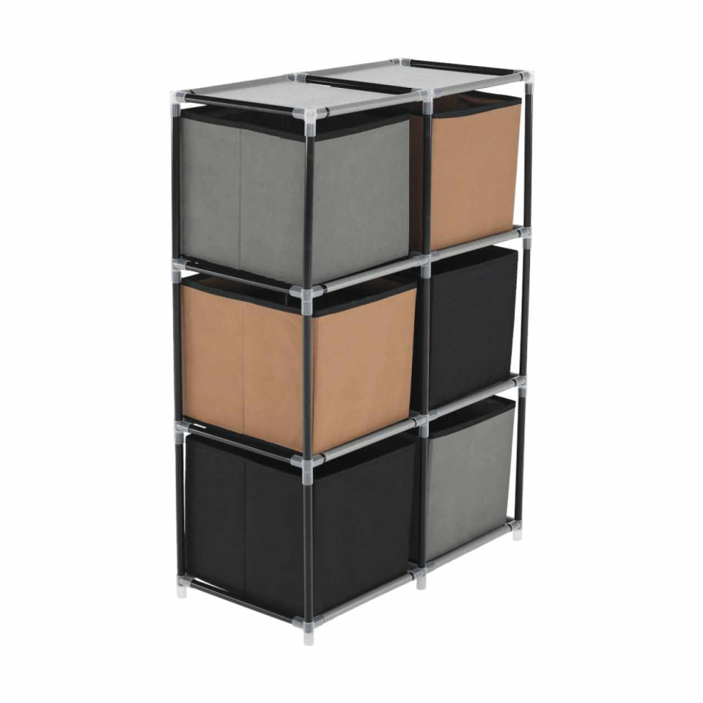 Szerkezet anyaga: fém Szín: fekete Anyag fiókok: szövet Szín: barna/szürke Kötőelemek anyaga: műanyag Méretek (SzxMéxMa): 58x30x83,5 cm Hat fiókkal Praktikus Fém szerkezet Szövet fiókok Fogantyúkkal Műanyag kötőelemek Egyszerű összeszerelés Többféle módon összerakható Szétszerelve szállítjuk