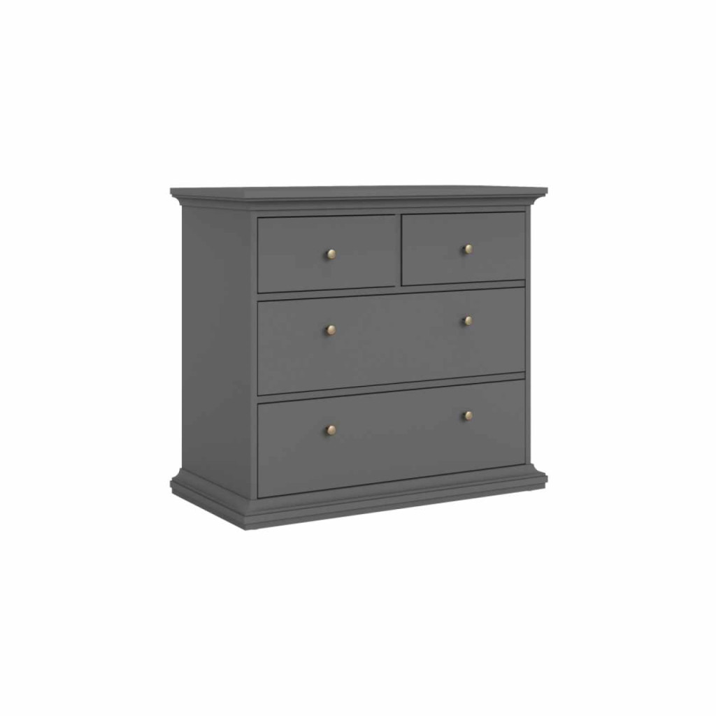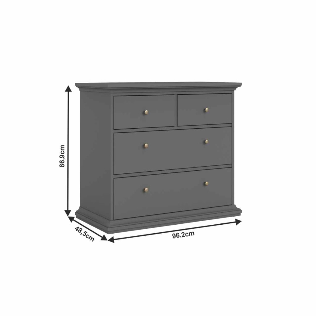 Anyag: laminált DTD/lakkozott MDF Szín: szürke Méretek (SzxVxH): 96,2x48,5x86,9 cm anyagvastagsága: 18 mm 4 fiók Fém fogas Provence stílusban Dekoratív díszlécek Szétszerelve szállítva.