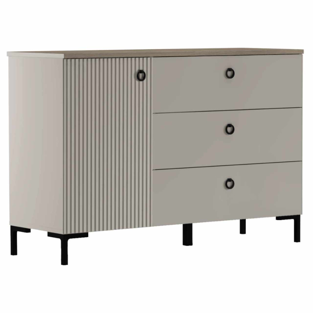 Anyag: laminált DTD/fóliázott MDFSzín: szürkésbarna Taupe/silverjack tölgyMéretek (SzxMéxMa): 120x41x81 cmDTD anyagvastagsága: 1,6-1,8 cmMDF anyagvastagsága: 1,9 cmEgyajtósPolcosHárom fiókFelső lap teherbírása: 10 kgPolc teherbírása: 5 kgFiók teherbírása: 3 kgFogantyúkkalFogantyú anyaga: fémFogantyú színe: matt feketeLábakonLábak magassága: 12 cmLábak anyaga: műanyagLábak színe: matt feketeDekoratív marású ajtókModern dizájnJavasoljuk a falhoz rögzítéstSzétszerelve szállítva