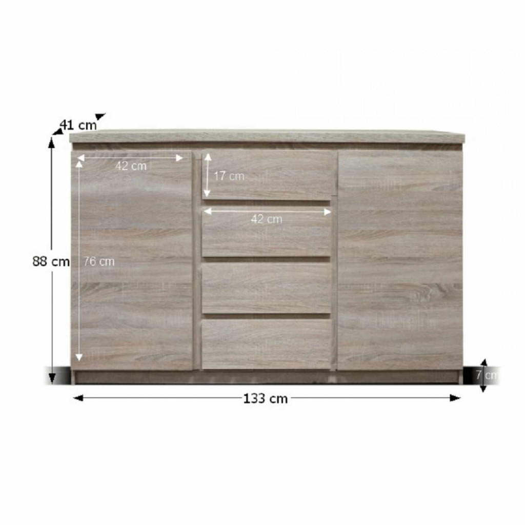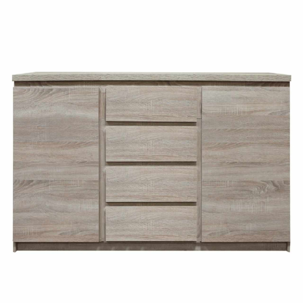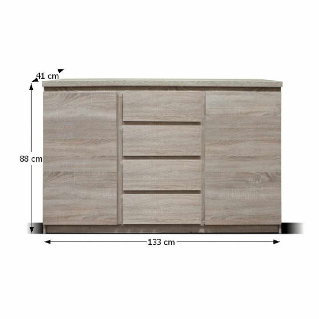 Kétajtós komód, négy fiókos, TYP 08. Anyag: laminált DTD, ABS élek. Szín: tölgyfa sonoma. Méretek SzéxMéxMa: 133x41x88 cm. Szétszerelve szállítjuk
