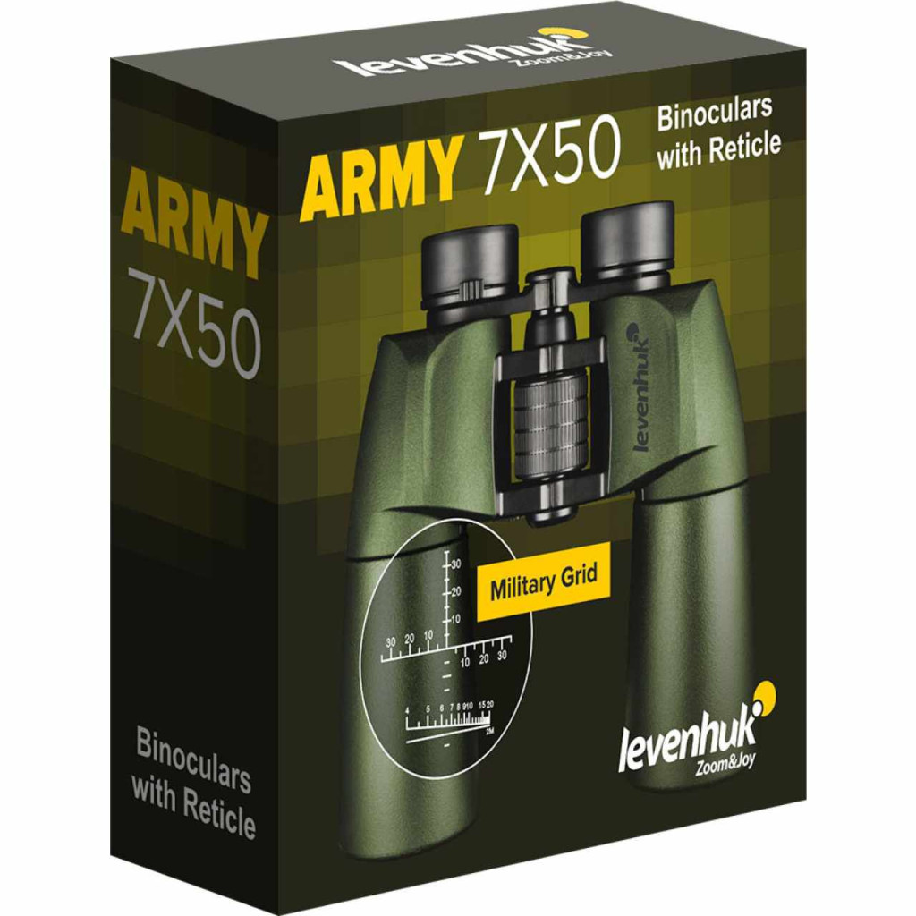 Az irányzékos Levenhuk Army 7x50 kétszemes távcső egy nagy rekesznyílású optikai eszköz, amely kiváló funkciókat kínál a vadászoknak, túrázóknak, horgászoknak és csónakázóknak. Professzionális célokra is kiváló, beleértve például a megfigyelést és a területőrzést. Ezzel a kétszemes távcsővel 7x nagyítás mellett nézheti a tájat és a távoli célpontokat, valamint különféle méréseket is végezhet. A kétszemes távcső szemlencséjében található skálákkal meghatározhatja az objektum magasságát és távolságát, valamint a vízszintes szöget és az emelkedési szöget.