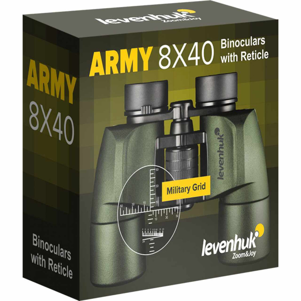 Levenhuk Army 8x40, irányzékkal – egyszerű terepi kétszemes távcső, amely még zord időjárási körülmények között is használható. Igazán jó megoldás vadászathoz, horgászathoz, taktikai megfigyeléshez és extrém sportokhoz. A kétszemes távcső egyik szemlencséje egy léptékes irányzékkal és egy távmérő skálával rendelkezik, így könnyen megmérhető a megfigyelt objektumtól való távolság, valamint az objektum magassága és szögei. A széles látószögnek köszönhetően nagy területen figyelheti az embereket, állatokat vagy járműveket.