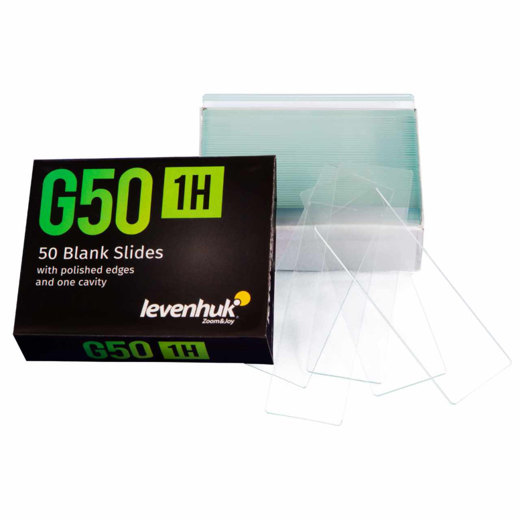 Levenhuk G50 1H vájulatos üres tárgylemezek. A készletben 50 darab, nagy átlátszóságú üres tárgylemez található. A tárgylemezeket úgy terveztük meg, hogy azok segítségével, valamint a függőcsepp technika alkalmazásával különféle mintákat figyelhessen meg a mikroszkóp alatt. Az amatőr mikroszkópiában a vízben található mikroorganizmusok megfigyelésére használják ezeket a tárgylemezeket, a szakembereknek viszont a klinikai és mikrobiológiai kutatásaikhoz vájulatos tárgylemezekre van szükségük.