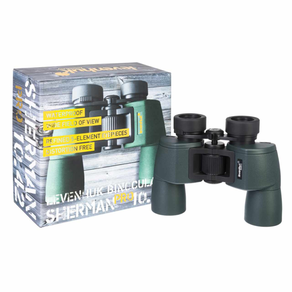 A modell optikai kialakításának alapját a Porro-prizma képezi. A szemlencsék öt részből állnak, három csoportra osztva. Ez a konstrukció sík látómezőt eredményez, a keletkezett képek élei pedig nem torzulnak el. A nagy szemtávolság miatt a Levenhuk Sherman PRO 10x42 használata még szemüveg viselése esetén is kényelmes.