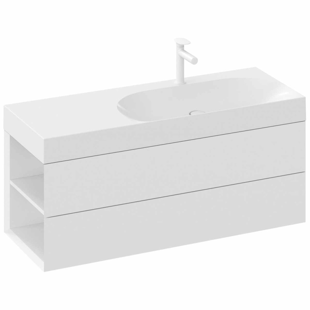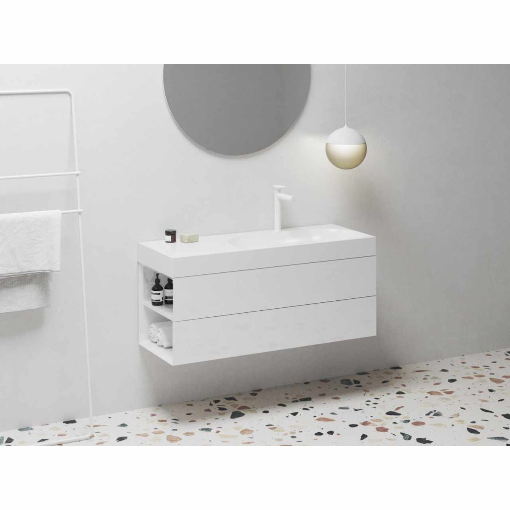 Öntött márvány Lite mosdó falra szerelhető vagy fali szekrénybe süllyesztve, túlfolyás nélkül. Fehér kivitelben. Bal változat. Mosdócsaptelep furattal.