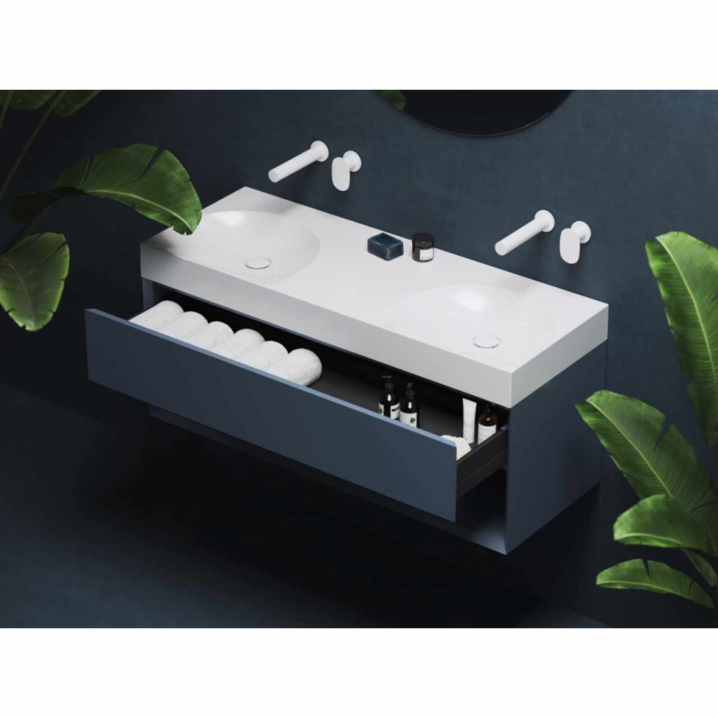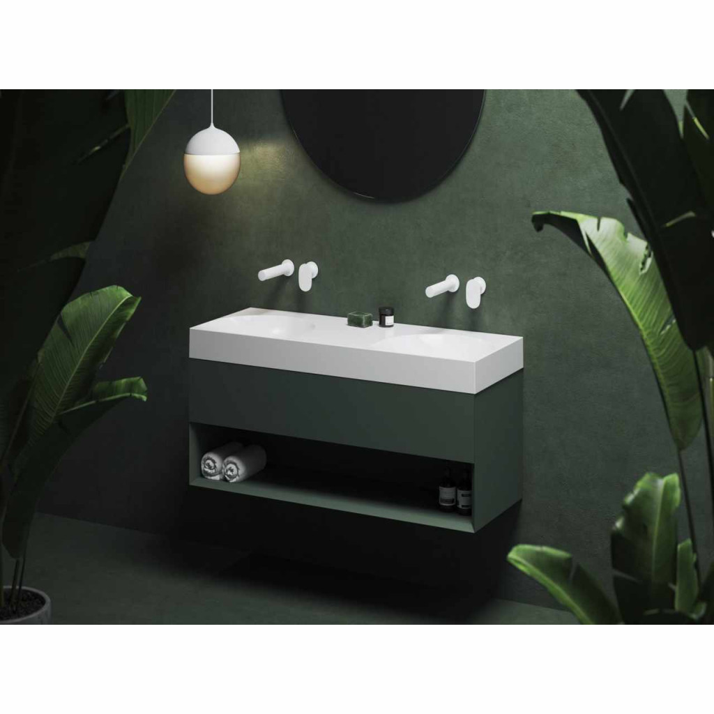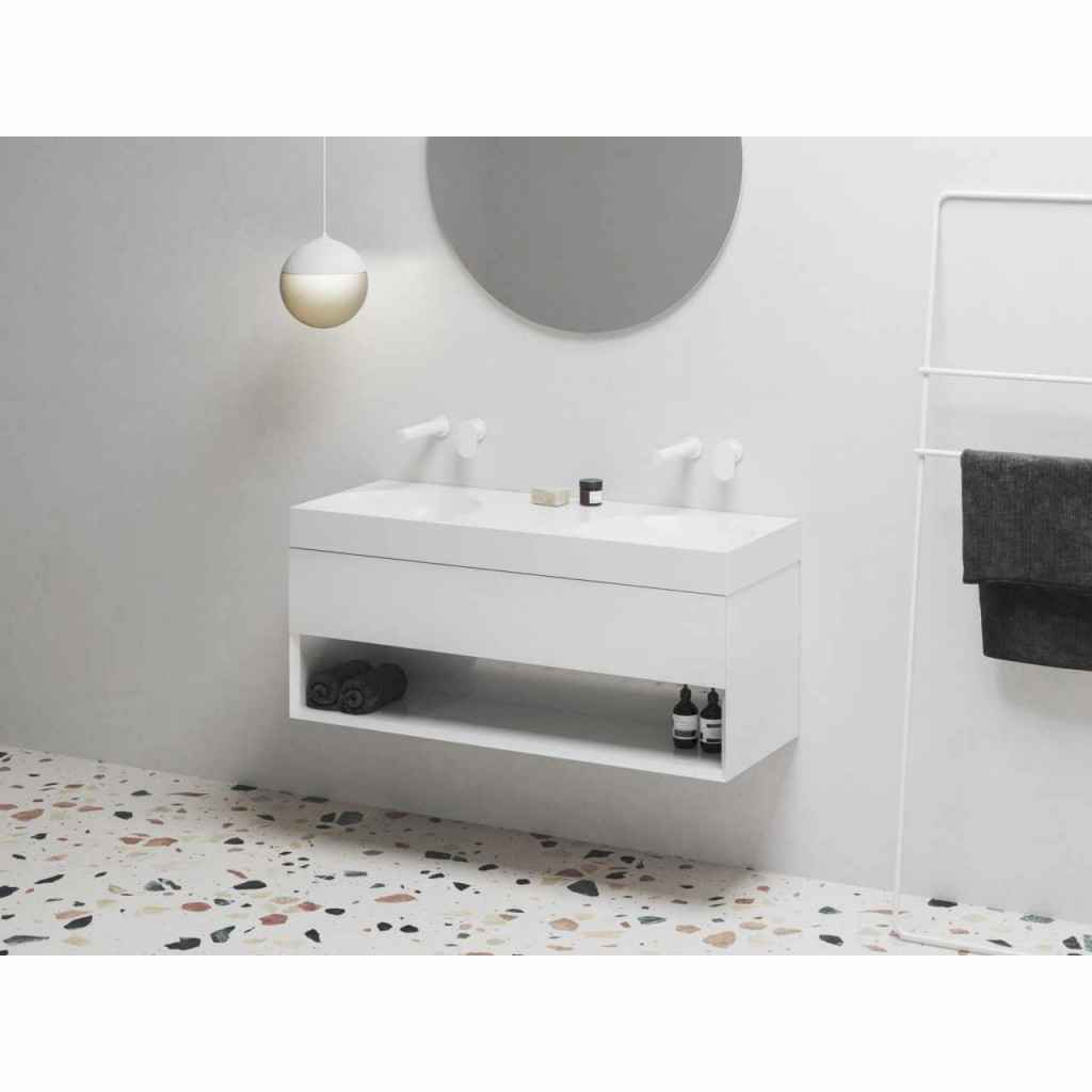 Öntött márvány Lite duplamosdó falra szerelhető, túlfolyó nélkül. Fehér kivitelben. Csaptelep furat nélkül - falba süllyesztett mosdócsapteleppel való kombináláshoz.