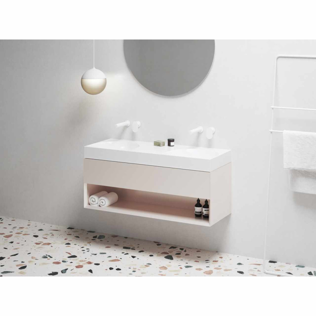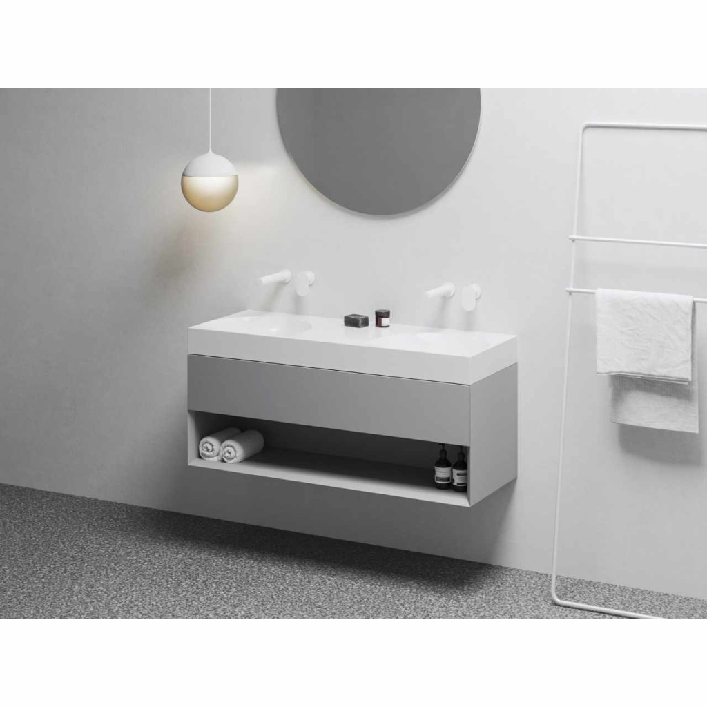 Lite 120 duplamosdó tárolórésszel. A mosdó nincs túlfolyóval ellátva, ezért fix mosdólefolyó alkalmazása szükséges, amely megakadályozza a víz túlfolyását. A mosdót úgy tervezték, hogy kombinálható legyen egy falba süllyesztett csapteleppel. A szerelőkészletet (csatlakozódugók, csavarok stb.) a csomagolás tartalmazza. A falra szerelhető vagy kiegészíthető az SD Lite 120 alatti szekrénnyel.