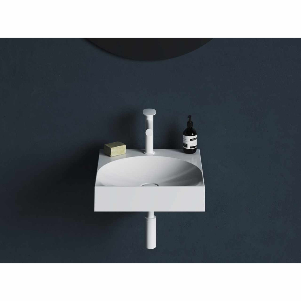 Öntött márvány Lite mosdó falra szerelhető, túlfolyó nélkül. Fehér kivitelben. Mosdócsaptelep furattal.