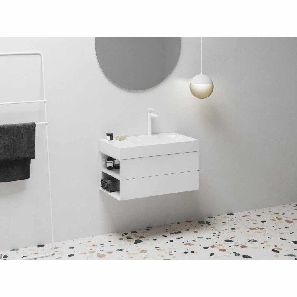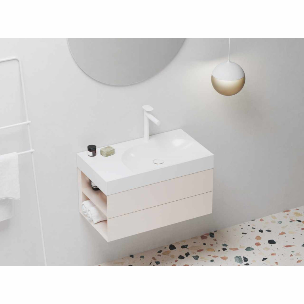 Öntött márvány Lite mosdó falra szerelhető vagy fali szekrénybe süllyesztve, túlfolyás nélkül. Fehér kivitelben. Bal változat. Mosdócsaptelep furattal.