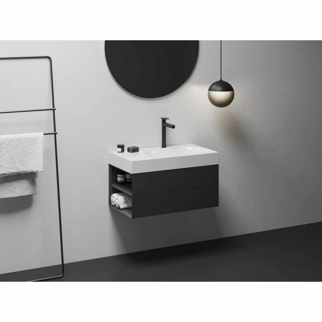 Lite 80/60 mosdó bal oldalon tárolórésszel. A mosdó nincs túlfolyóval ellátva, ezért fix mosdólefolyó alkalmazása szükséges, amely megakadályozza a víz túlfolyását. A mosdón előre fúrt lyuk van a talapzaton lévő mosdócsaptelep számára. A szerelőkészletet (csatlakozódugók, csavarok stb.) a csomagolás tartalmazza. A falra szerelhető vagy kiegészíthető az SD Lite 80 vagy SD Lite 80 bal alatti szekrénnyel.