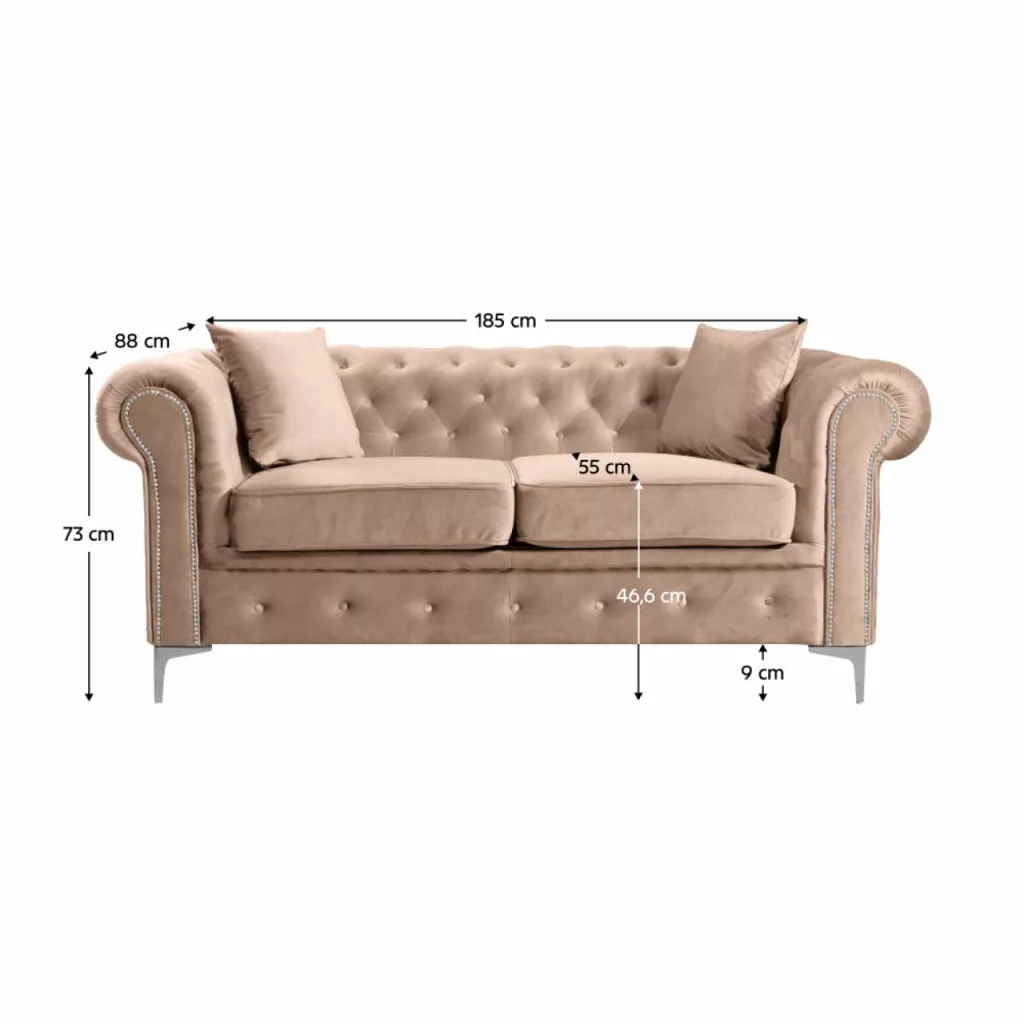 Kárpit anyaga: szövet Velvet 28A szövet kopásállósága a Martindale teszt szerint: 50 000 ciklusKárpit színe: világosbarnaMéretek (SzxMéxMa): 185x88x73 cmÜlés magassága: 46,6 cmÜlés mélysége: 55 cmFém lábakonLábak színe: ezüstAz alsó tér magassága a padlótól: 9 cmTeherbírás/személy: 120 kgTöltet: falista rugó Keménysége: T30Teljesen kárpitozottÍzlésesLuxusChesterfieldSteppeltDekoratív gombokDekoratív gombok színe: ezüstKét párnával szállítvaAz ülőrész tépőzárral van ellátvaSzétszerelve szállítvaMegrendelhető a Velvet szövet 5 színárnyalatában 8-10 hét szállítási idővel. Egyedi megrendelés esetén az összeg 20%-át előlegként szükséges befizetni. Az előleg befizetése után a megrendelése gyártásba kerül.