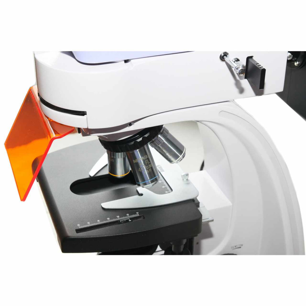 Öt objektív. A fényvisszaverő fényforrás központosítására egy szabad rés szolgál. A szabad nyílásba egy további objektív is beszerelhető az extra nagyítás eléréséhez. Az objektívlencsékkel ellátott revolverfej a belső rész felé néz – a felhasználó láthatja az optikai útvonalba illesztett objektívet, és a tárgyasztal feletti szabad területet.
