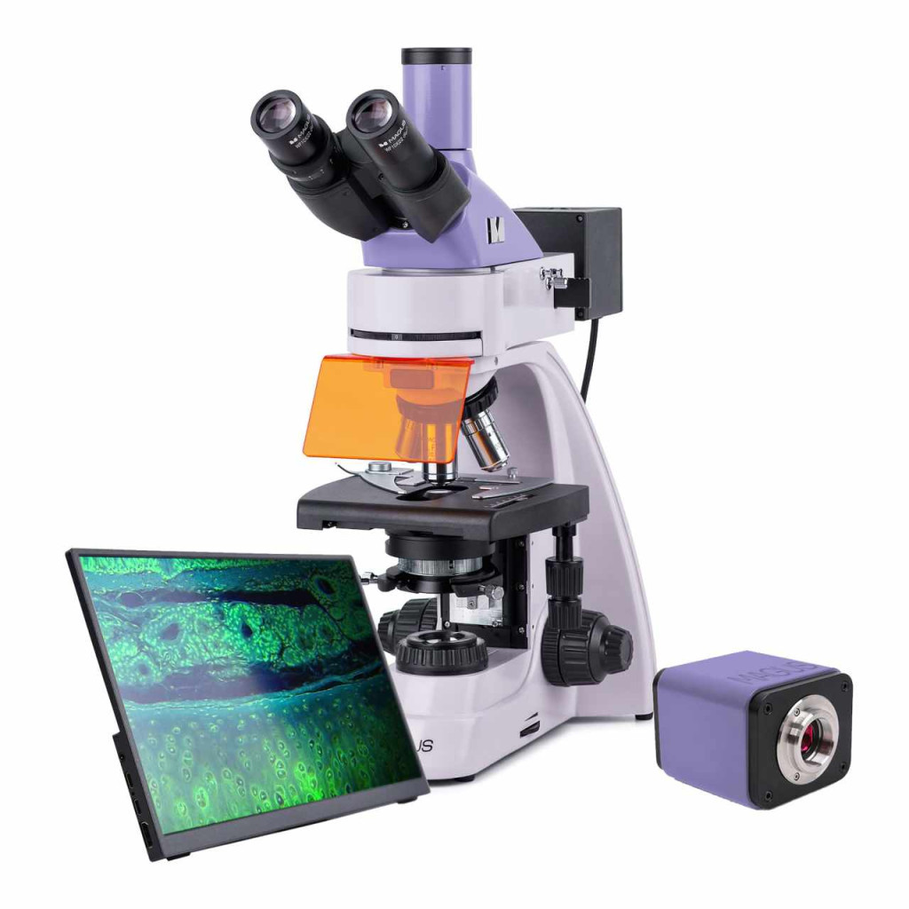 Fluoreszcens gerjesztési fényforrás: 5 W-os, négy különböző hullámsávú LED: kék (B), zöld (G), ibolya (V) és ultraibolya (UV). A LED-ek között a gyűrű elforgatásával lehet váltani. A LED-ek azonnal teljes fényerővel világítanak, nem forrósodnak át a hosszú használat során, és szükség esetén gyorsan kikapcsolnak. Ez oda-vissza megkönnyíti a világos látóterűről a fluoreszcens technikára való áttérést. A LED-ek élettartama 50 000 óra. A legbiztonságosabb és kevés karbantartást igénylő lehetőségként javasolt LED-alapú fluoreszcens mikroszkópot választani oktatási célokra.
