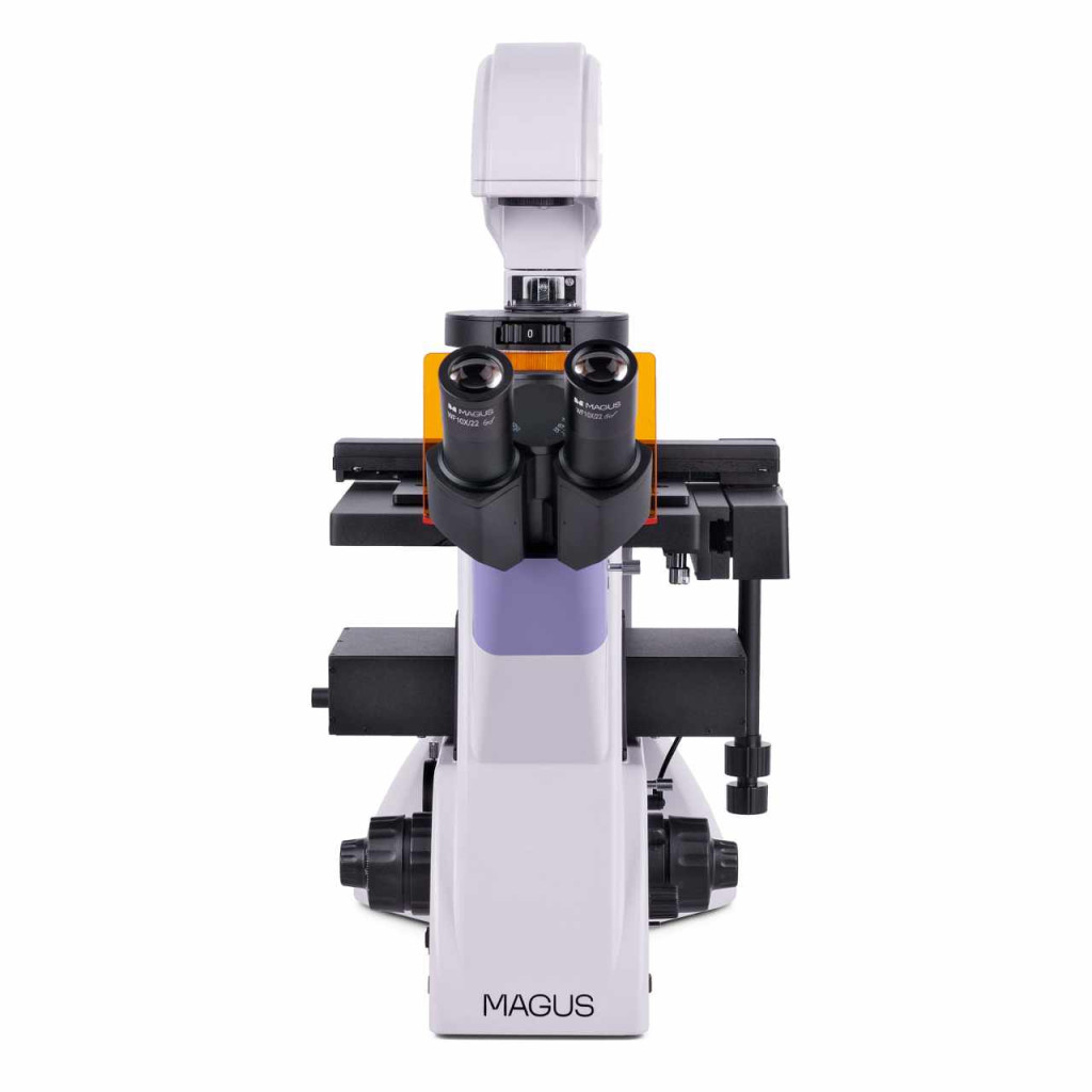 Tubus hossza – végtelen (∞). A mikroszkóp összeszerelésekor a felhasználó 180°-ban elforgathatja a szemlencsecsöveket, és beállíthatja a magasságához megfelelő szemtávolságot. A mikroszkóp háromszemlencsés fejrésszel rendelkezik. A monitor a háromszemlencsés fejrész függőleges tubusába és a digitális kamerába van szerelve – a kamera oldalsó portjába. A háromszemlencsés fejrészen egy 80:20-as sugárosztó, a házon pedig egy 2-állású sugárosztó (100:0/0:100) található.
