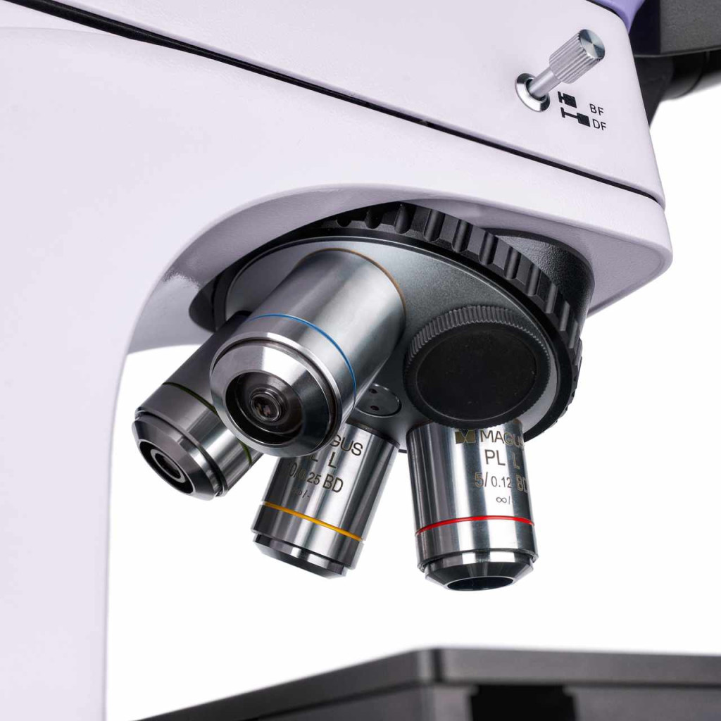 A mikroszkóp nagyítása alapkonfigurációban 50–400x. További objektívek és okulárok növelik a nagyítási tartományt. A mikroszkóp sík akromatikus objektíveket használ nagy munkatávolsággal a fénymezős és sötétmezős mikroszkópiás technikákhoz. A revolverfejben öt nyílás van objektívek felszereléséhez – négy objektív a termékkel szállítva, egy pedig opcionális. Az objektívekkel ellátott revolverfej a belső tér felé van tájolva – a felhasználó láthatja az optikai útvonalba behelyezett objektívet.