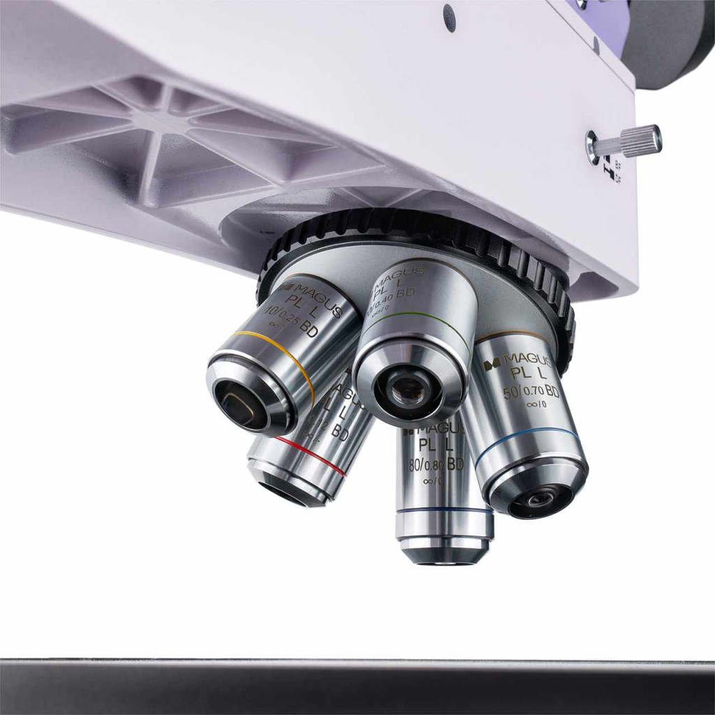 A BD szimbólummal jelzett sík-akromatikus objektíveket kifejezetten világos és sötét látóterű mikroszkópiai technikákhoz tervezték. Az objektíven nagy munkatávolsággal rendelkeznek. Ötöt mellékelünk a termékhez, amelyeket a revolverfej egy-egy foglalatába lehet szerelni. A beszerelt objektívek szükség szerint gyorsan kicserélhetők opcionális objektívekre. Végtelenre korrigált optikai elemek 50–800x nagyítással. Az objektívekkel ellátott revolverfej a belső tér felé van tájolva – a felhasználó láthatja az optikai útvonalba behelyezett objektívet.
