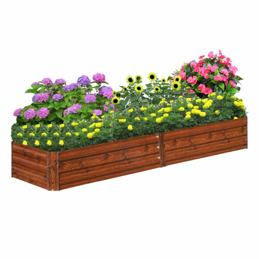 Virágágy anyaga: acél/alumíniumSzín: barna/mintás faKülső méretek (SzxMéxMa): 160x80x30 cmBelső méretek (SzxMéxMa): 155x75x30 cmAnyagvastagság: 0,3 mm, sarok 0,8 mmAlkalmas bentre és kintreAlj/padló nélkül szállítvaKönnyű összeszerelésAcél porszórt felületkezelésselGyógynövényekhez, virágokhoz vagy zöldségekhezKülönböző igényű növényekhezNagyobb védelem a csigák ellenKisebb hajlam a gyomnövekedésreIdeális tápanyagszegény talajú helyekreA legkisebb kertekbe is alkalmasModern dizájnSokoldalú felhasználásAlkalmas ajándékkéntBontásban szállítva