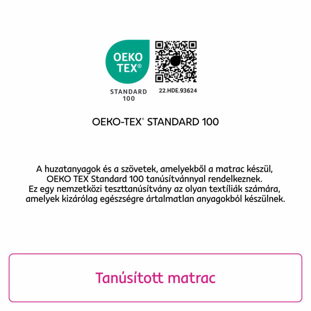 Anyag: rugalmas hab/huzatMéretek (SzxHo): 80x200 cmMatrac magassága: 12 cmTeherbírás/személy: 80 kgKétoldalasMatrac keménysége: közepesen kemény H3CipzárralLevehető40 °C-on moshatóOEKO-TEX STANDARD tanúsítvánnyal rendelkező matracLamella ágyrács használatát javasoljukMinimum 28 lamellaA lamellák közötti hely max. 6 cmA matrac vákuumcsomagolású, ezért a kicsomagolása után ajánlott 3-5 napig egyenletes felületen hagyni, hogy visszanyerje az alapvető magasságát.