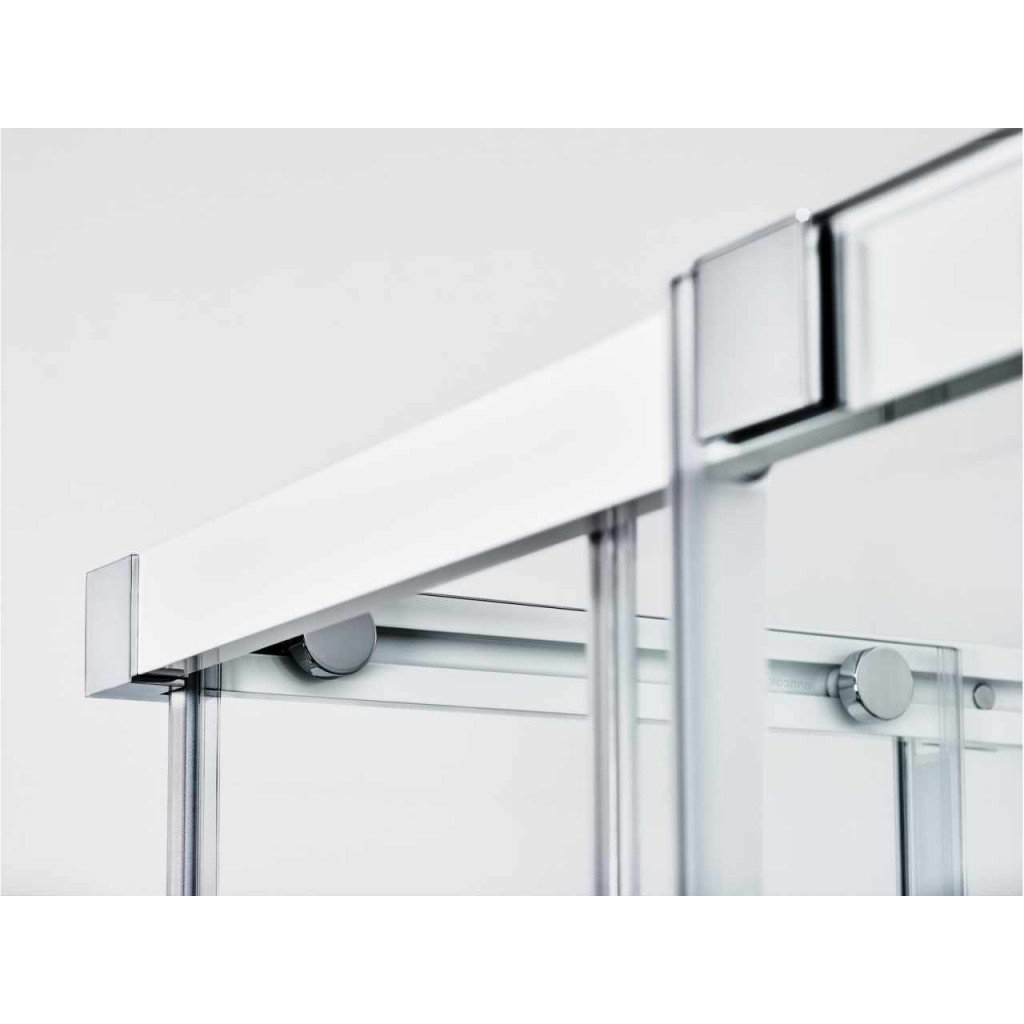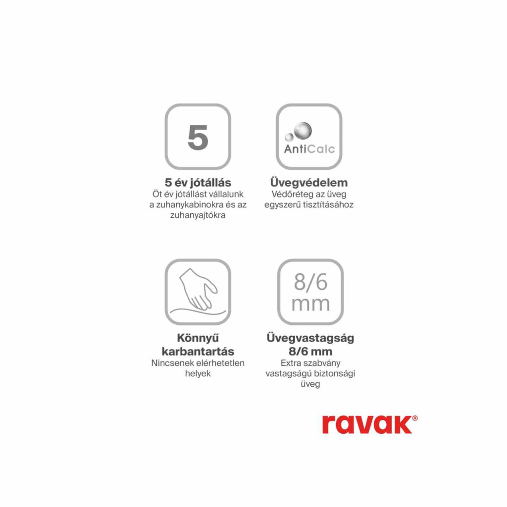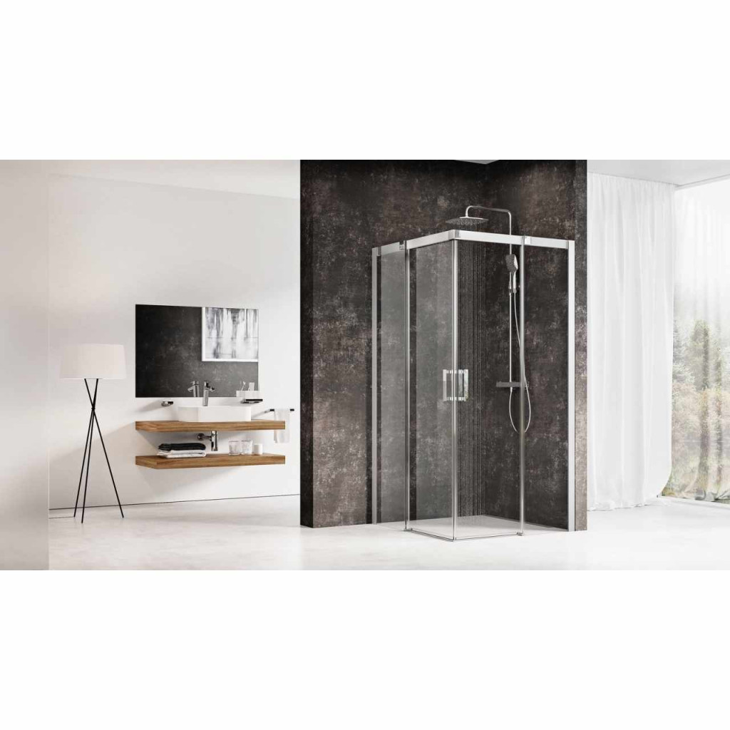 Négyrészes Matrix sarokzuhany matt króm kivitelben és tiszta üvegbetéttel, melyet Ravak AntiCalc® védőréteg borít. Toló nyitórendszer.