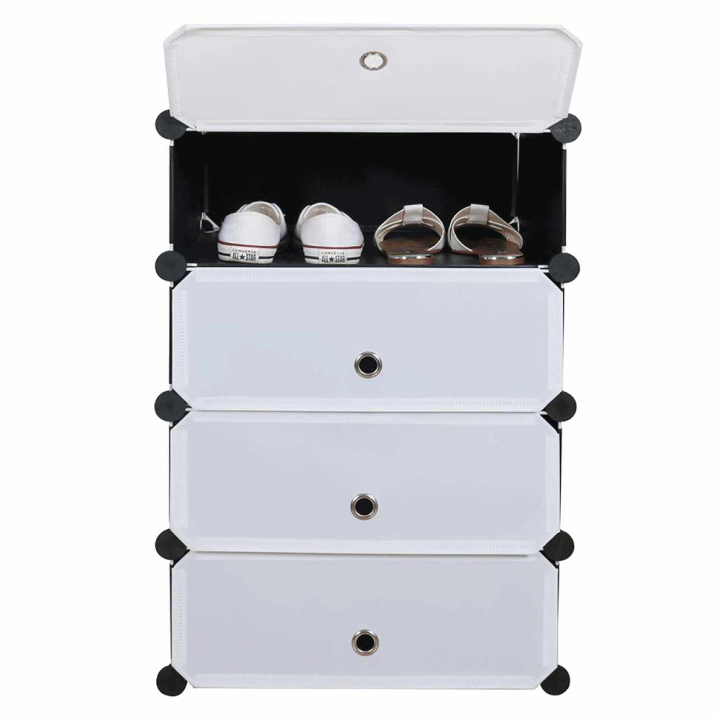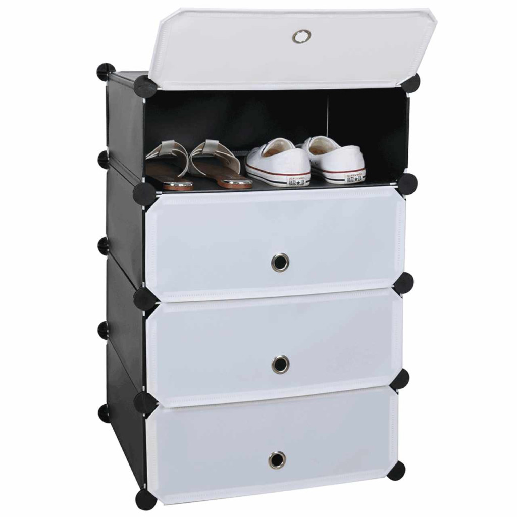 Szerkezet anyaga: fém Rekeszek anyaga: műanyag Szín: fekete/ fehér Méretek (SzxMéxMa): 49x37x76 cm A rögzítők szilárd ABS műanyagból készültek Változatos elrendezés Teherbírás/rekesz: 3 kg 4 tároló rekesz A rekeszeket egyenletesen kell terhelni Szervező/cipőtároló Fém szerkezet Alkalmas előszobába és előcsarnokba Sokoldalú használat, nem csak cipőtárolóként Bontásban szállítva