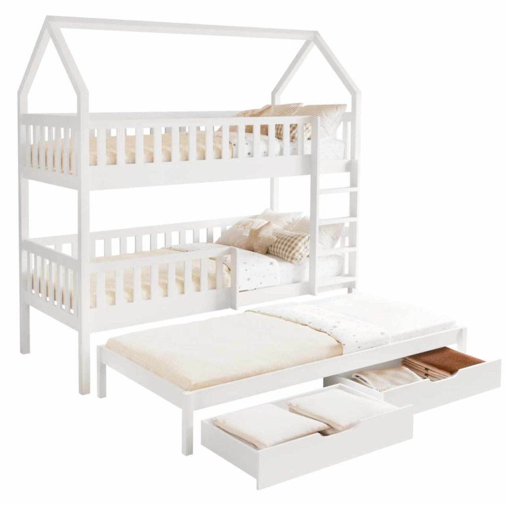Anyag: fenyőfa/furnérSzín: fehérMéretek (SzxMéxMa): 212x97x221 cmAlvófelület (SzxHo): 90x200 cmAnyagvastagság: 2 cmMagasság az alsó és felső ágy között: 76 cmHázikó alakú ágyFelső ágy teherbírása: 90 kgAlsó ágy teherbírása: 95 kgPótágy teherbírása: 90 kgLábakonLábak magassága: 34 cmKét fiókFiók méretei (SzxMa): 93x19 cmPótággyalPótágy méretei (SzxMéxMa): 200x95x31 cmPótágyra illő matrac méretei: 90x195 cmLétrávalLeesésgátlóvalA leesésgátló a bal vagy a jobb oldalra is felszerelhetőMatrac nélkül szállítvaRugós matrac megvásárolható a kínálatunkbólMatrac ajánlott magassága a felső ágyhoz: max. 14 cmMatrac ajánlott magassága az alsó ágyhoz: max. 18 cmMatrac magassága a pótágyra max. 5,5 cmRétegelt lemez hengerelt lécekkel szállítjukKét ágyra nyitható szétSzétszerelve szállítjuk