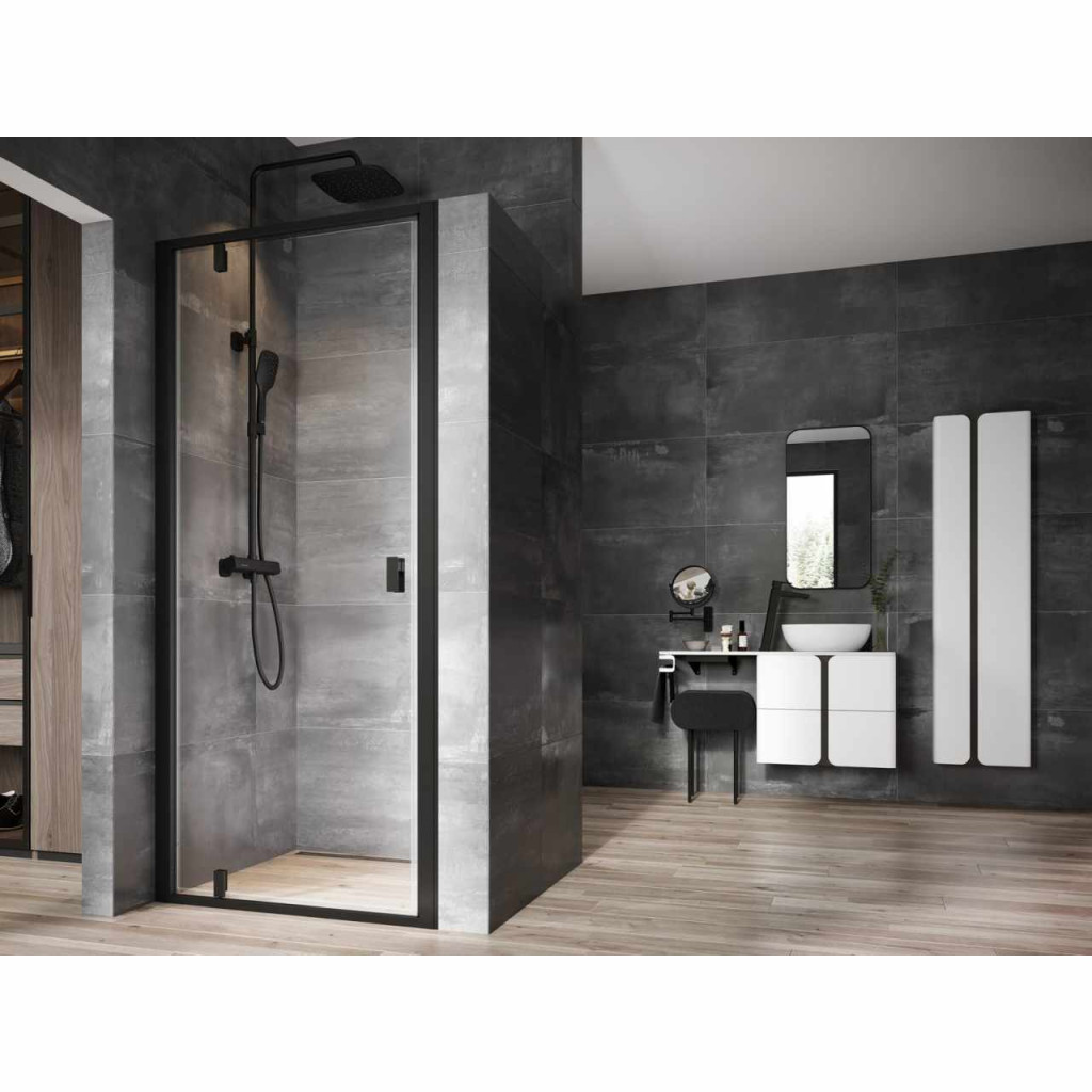 Egyrészes Nexty zuhanyajtó fekete kerettel, fogantyúval és zsanérral. A betétlemez Ravak AntiCalc® vízlepergető réteggel ellátott, átlátszó biztonsági üvegből készült. Pivot forgózsanéros nyílórendszer. Forgatható termék, bal és jobb oldali kivitel kialakításához.