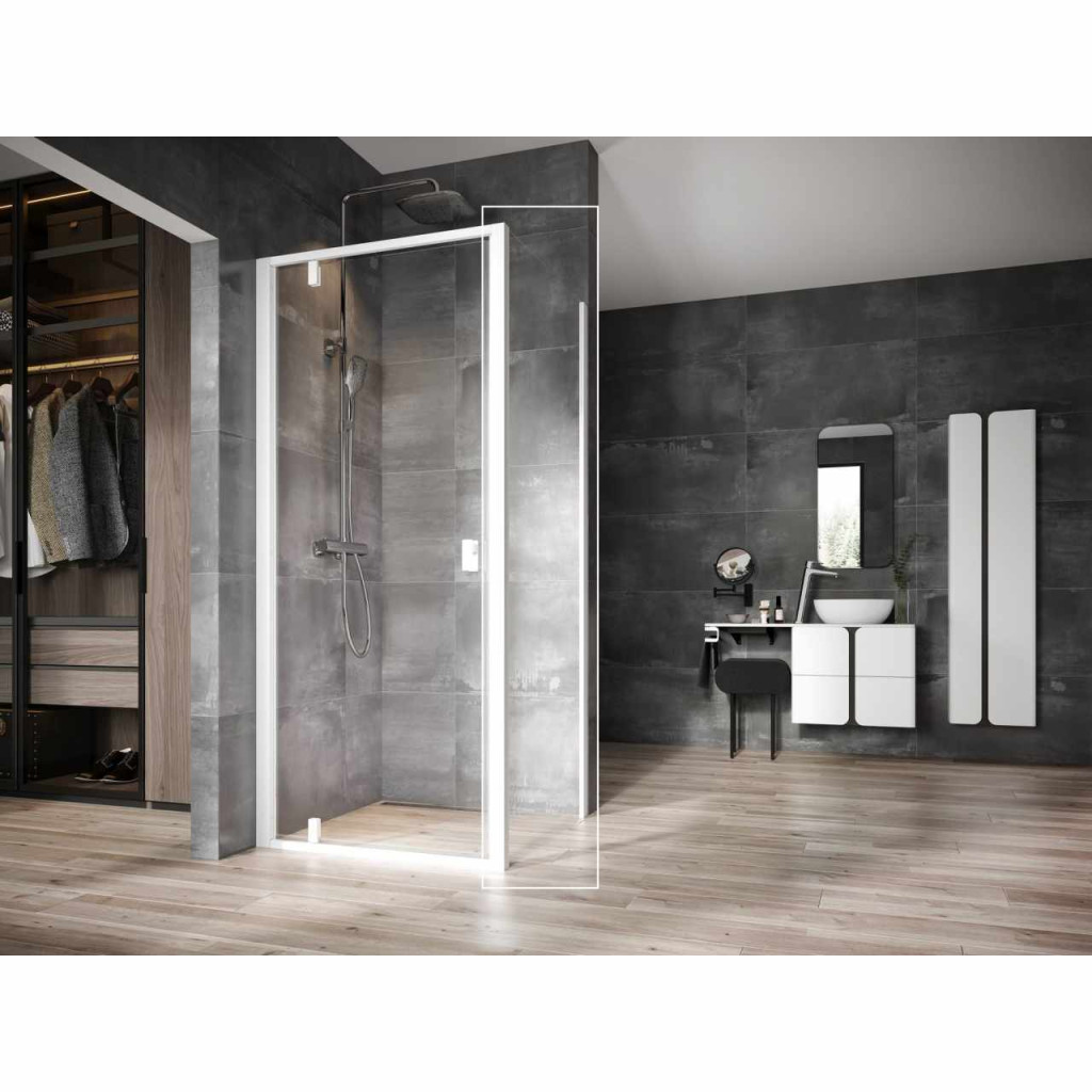 Nexty fix fal matt fehér színben. Átlátszó, edzett biztonsági üvegből készült, Ravak AntiCalc® vízlepergető réteggel ellátva. Forgatható termék bal és jobb oldali kivitel kialakításához.