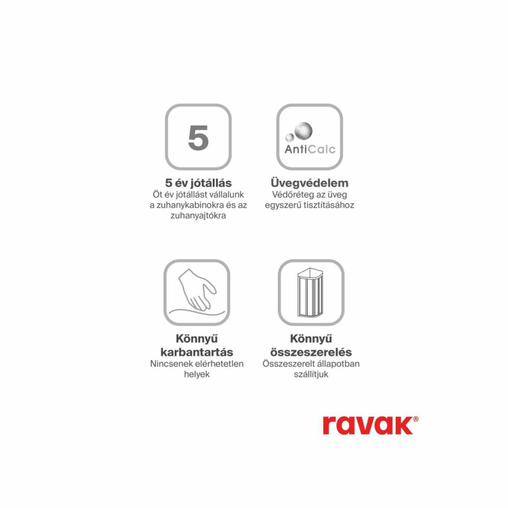 Kétrészes zuhanyajtó szatén kerettel, fogantyúkkal és zsanérokkal. Átlátszó, edzett biztonsági üvegből készült, Ravak AntiCalc® vízlepergető réteggel ellátva. Pivot, forgózsanéros nyílórendszer. Forgatható termék bal és jobb oldali kivitel kialakításához.