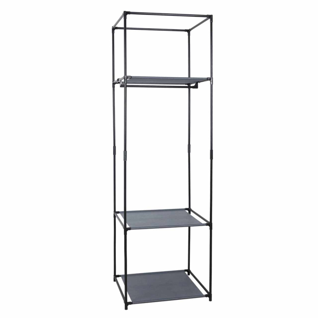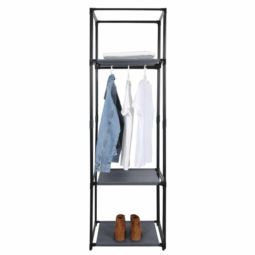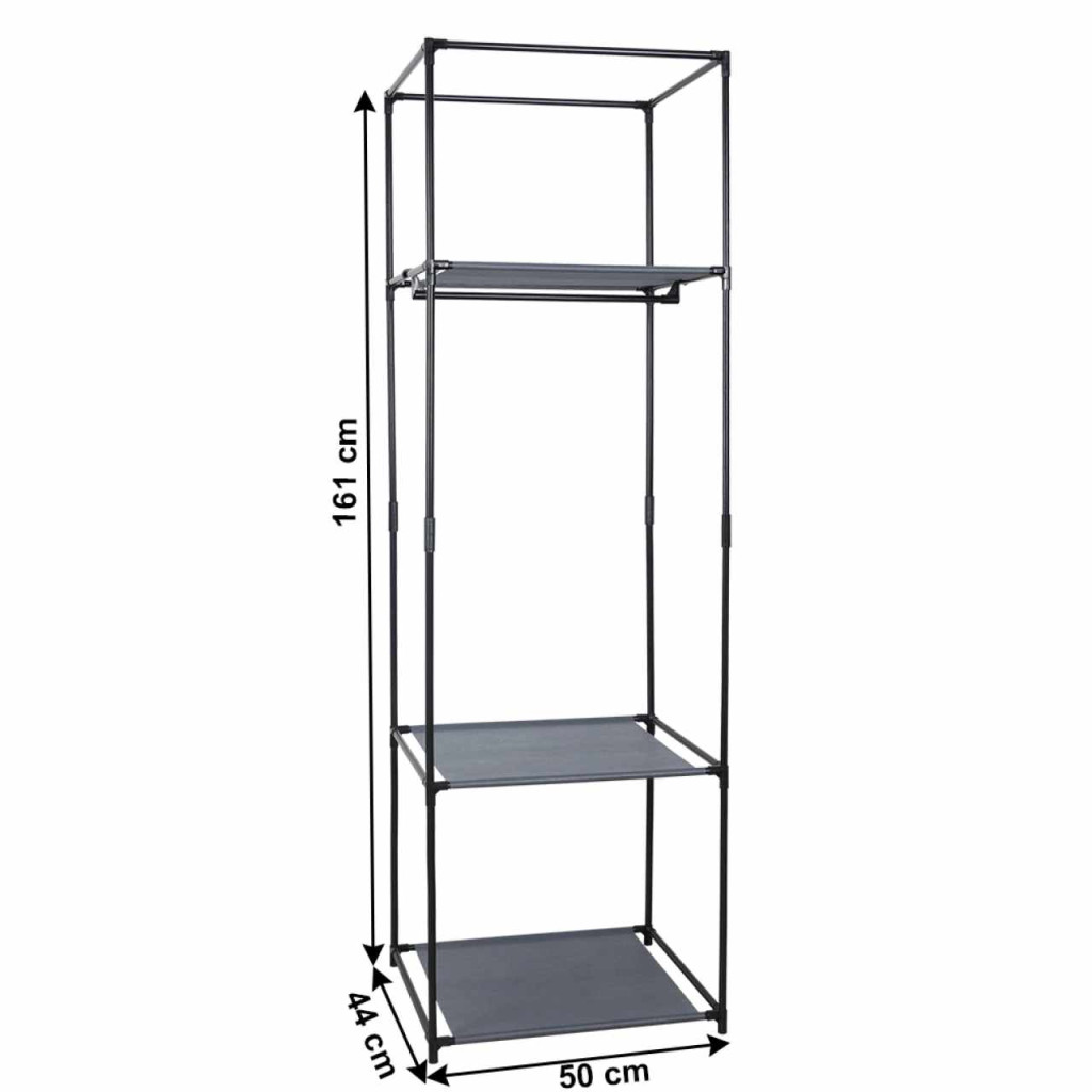 Szerkezet anyaga: fém Szín: fekete Anyag polc: szövet Szín: fekete Méretek (SzéxMéxMa): 50x44x161 cm Polc teherbírása: 3 kg Egyenletes terhelés szükséges Modern dizájn Praktikus fogas ruhákra és kiegészítőkre 1 akasztórúd, 3 polc Alkalmas ruhás szekrénybe, előszobába, hálószobába vagy tanulószobába Bontásban szállítva