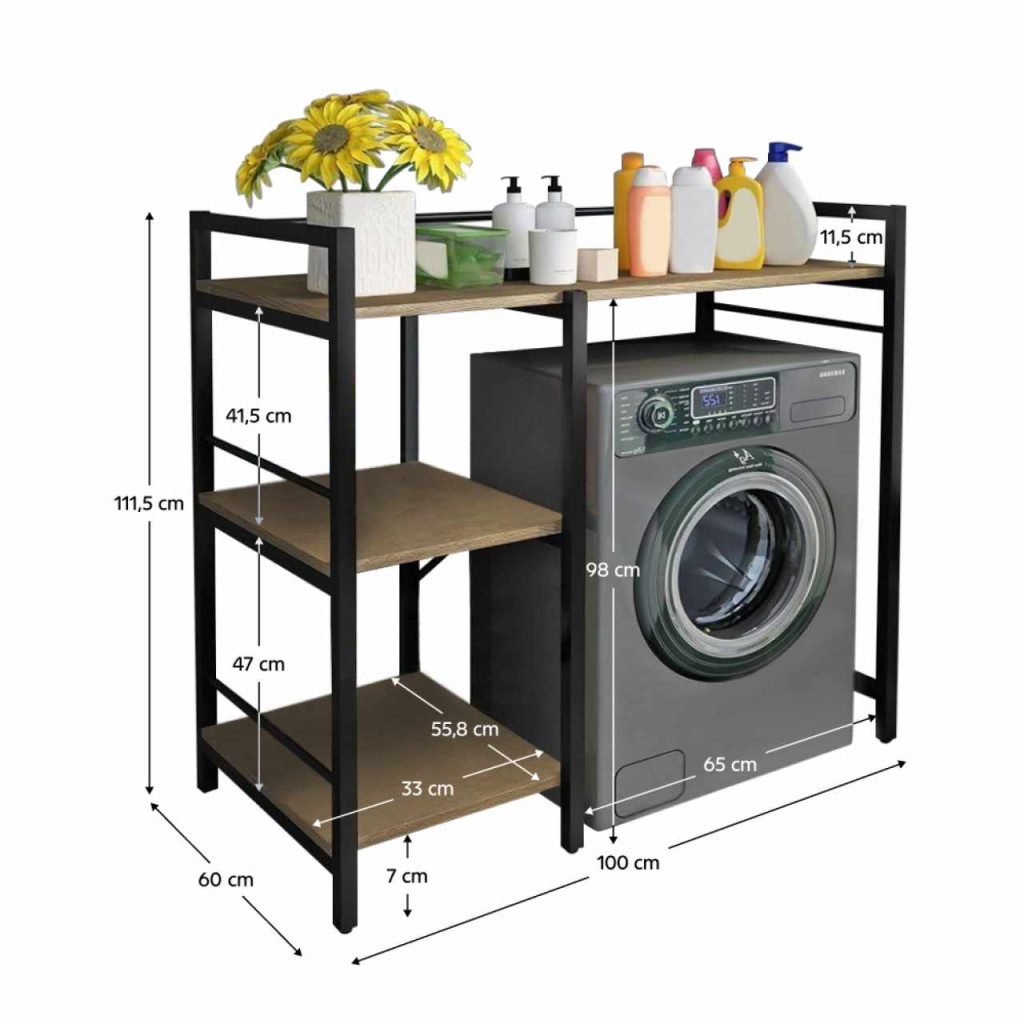 Anyag: laminált MDF/fémSzín: tölgy/feketeMéretek (SzxMéxMa): 100x60x111,5 cmHely a mosógépnek: 65x98 cmAnyag vastagsága: 1,2 cmSúly: 12,2 kgLábak magassága: 7 cmNyitott polcokTeherbírás/polc: 5 kgUniverzálisPraktikus tárolóhely kialakításaMosógéphez alkalmas Rendet és szervezettséget visz a fürdőszobábaSzétszerelve szállítva