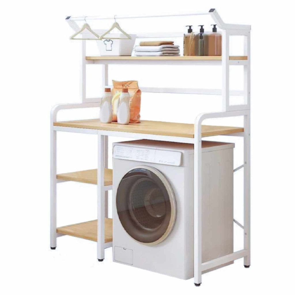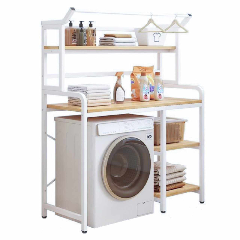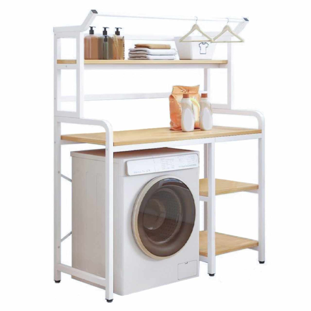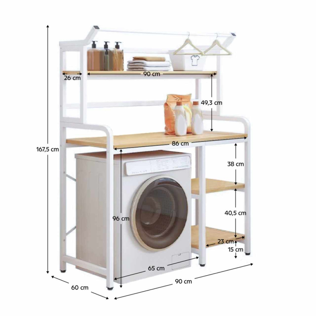Anyag: laminált MDF/fémSzín: tölgy natural/fehérMéretek (SzxMéxMa): 90x60,5x167,5 cmHely a mosógépnek: 65x97 cmAnyag vastagsága: 1,2 cmSúly: 14,2 kgTeherbírás/polc: 5 kgLábak magassága: 16 cmNyitott polcokUniverzálisPraktikus tárolóhely kialakításaMosógéphez alkalmasRendet és szervezettséget visz a fürdőszobába és mosókonyhábaAlkalmas toalettcikkek, törölközők és tárolókosarak elhelyezéséreLehetőség van a ruhaakasztók felakasztására a ruhák szárításáhozSzétszerelve szállítva