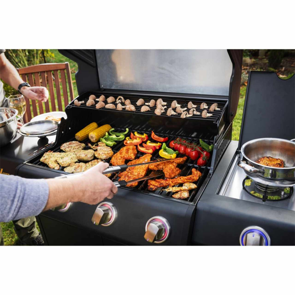 • praktikus, kompakt és kellemes árfekvésű grillsütő, mely alkalmas kisebb és közepes családi vagy baráti összejövetelekre • remek felszereltség a kényelmes és egészséges grillezéshez • a két fő rozsdamentes acél gázégő felső burkolattal és zsiradék elvezetéssel rendelkezik, aminek köszönhetően elkerülhető a zsiradék túlégés és károsanyag keletkezés • a könnyen lefedhető oldalsó gázégővel pl. meleg italok, szószok vagy köretek készíthetők, lefedésével pedig hasznos, második előkészítő felületként szolgálhat • könnyű begyújtást az elektromos piezo rendszer biztosítja mind a három nagy szabályozógombban • a melegítőfelület és a grillrács a hosszabb életartam érdekében zománcozott • a második kihajtható grillrács a húsok, zöldségek indirekt grillezése vagy melegítése / melegen tartása esetén hasznos • a könnyen hozzáférhető tárolótér megfelelő védelmet biztosít az esetleges szél ellen • integrált gázpalack tartó a grill belsejében, amelyben (a legtöbb konkurens, hasonló kategóriájú terméktől eltérően) kényelmesen elfér akár egy 10 kg-os gázpalack is • magas lakkozott fedél beépített hőmérővel és fém fogantyúval • előkészítő/tároló felület a grill mindkét oldalán (az egyikben a beépített oldalsó égővel) • négy praktikus tartóhorog a grilleszközöknek, 4 lefékezhető kerék • elegáns fekete lakkozás, ami e terméktípusnál nagyon hasznos a tisztítás és karbantartás szempontjából • a grillsütő tartozéka a gáztömlő és a szabályozó csatlakozó 5 vagy 10 kg-os gázpalackhoz
