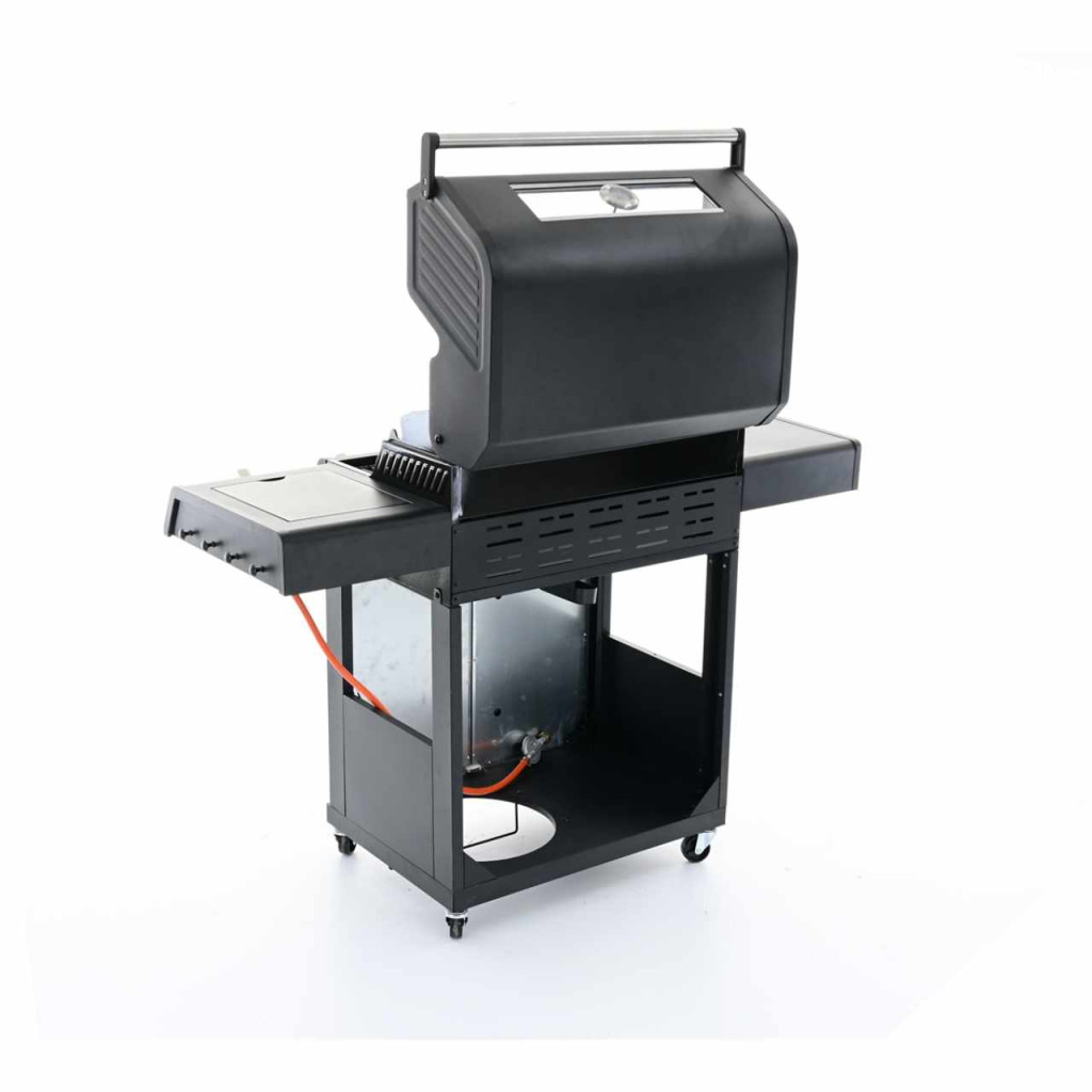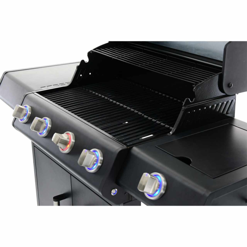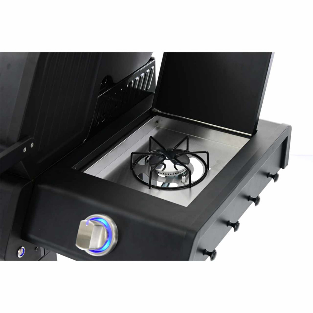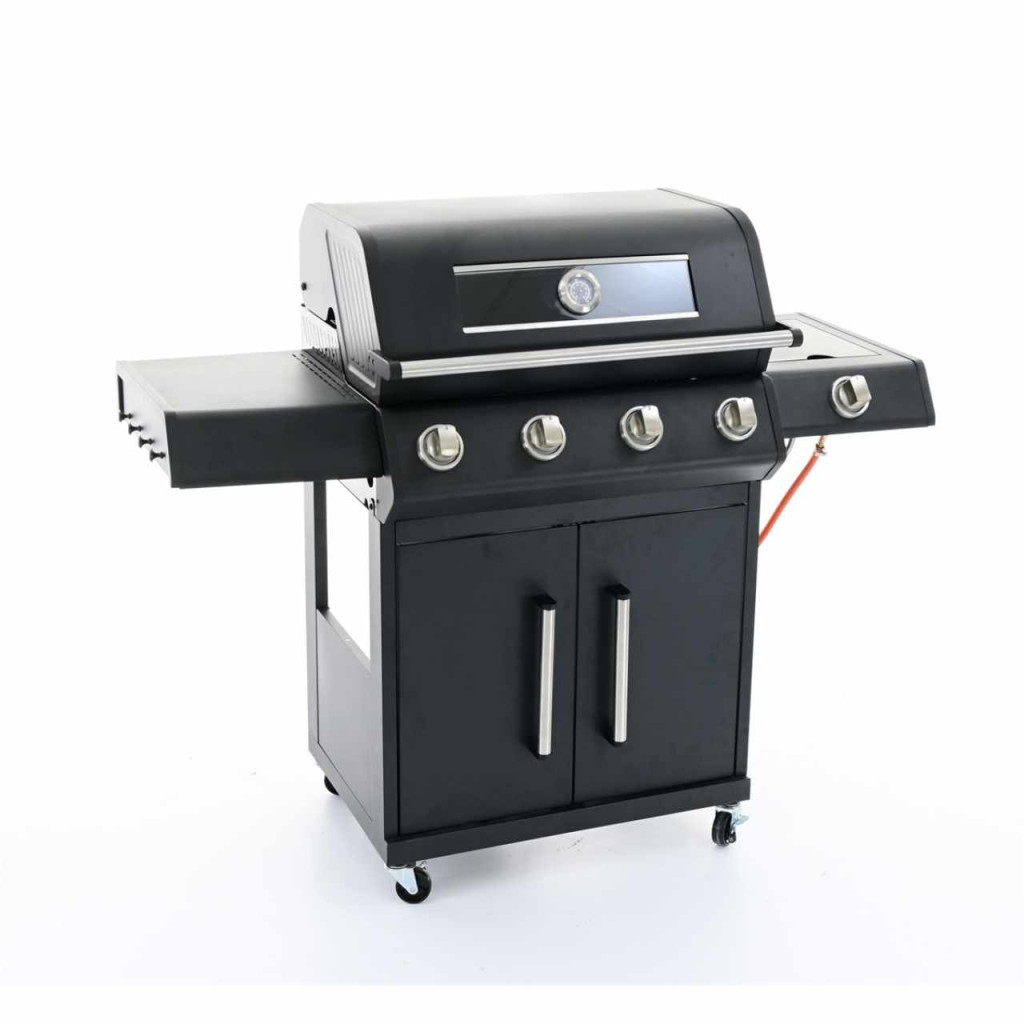 • luxuskategóriás, robusztus szerkezetű, elegáns dizájnú grillsütő, amely alkalmas akár szűkkörű családi grillezésre vagy akár nagyobb baráti összejövetelekre és ünnepségekre is • remek felszereltség a kényelmes és egészséges grillezéshez • a négy fő rozsdamentes acél gázégő felső burkolattal és zsiradék elvezetéssel rendelkezik, aminek köszönhetően elkerülhető a zsiradék túlégés és károsanyag keletkezés • a könnyen lefedhető oldalsó gázégővel pl. meleg italok, szószok vagy köretek készíthetők, lefedésével pedig hasznos, második előkészítő felületként szolgálhat • könnyű begyújtást az elektromos piezo rendszer biztosítja mind az öt nagy szabályozógombban, melyek hatásos LED alávilágítással is el vannak látva, így egyből látható, hogy az adott égő ég (piros) vagy nem (kék) • a melegítőfelület a hosszabb életartam érdekében zománcozott, míg a grillrács tartós öntvényből készül • a második kihajtható grillrács a húsok, zöldségek indirekt grillezése vagy melegítése / melegen tartása esetén hasznos • a könnyen hozzáférhető tárolótér megfelelő védelmet biztosít az esetleges szél ellen • integrált gázpalack tartó a grill belsejében, amelyben (a legtöbb konkurens, hasonló kategóriájú terméktől eltérően) kényelmesen elfér akár egy 10 kg-os gázpalack is • magas lakkozott, tökéletesen szigetelő duplafalas fedél beépített hőmérővel és fém fogantyúval és kémlelővel, melynek köszönhetően a fedél felnyitása nélkül ellenőrizhető a készülő étel • előkészítő/tároló felület a grill mindkét oldalán (az egyikben a beépített oldalsó égővel) • négy praktikus tartóhorog a grilleszközöknek, 4 lefékezhető kerék • elegáns fekete lakkozás, ami e terméktípusnál nagyon hasznos a tisztítás és karbantartás szempontjából • a grillsütő tartozéka a gáztömlő és a szabályozó csatlakozó 5 vagy 10 kg-os gázpalackhoz