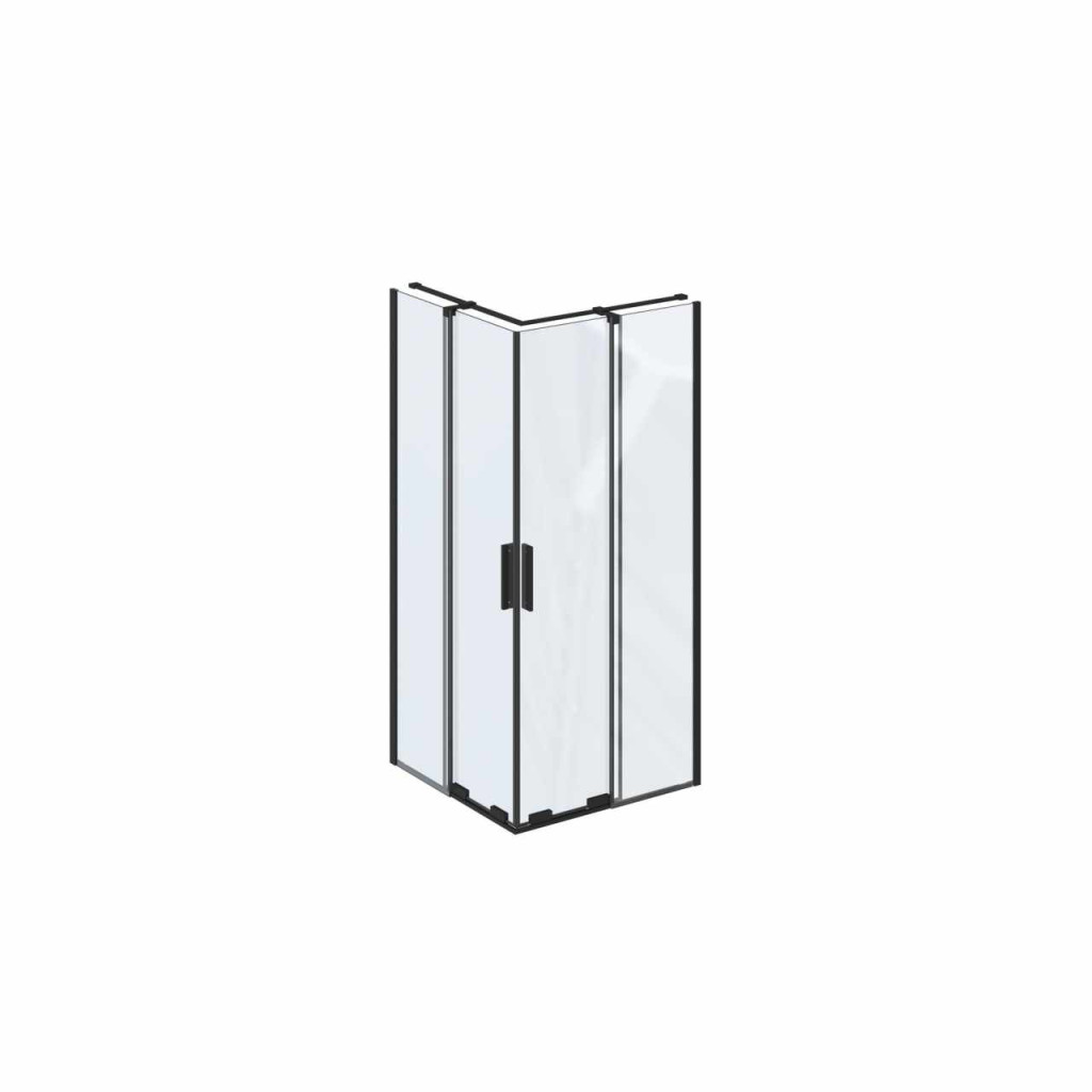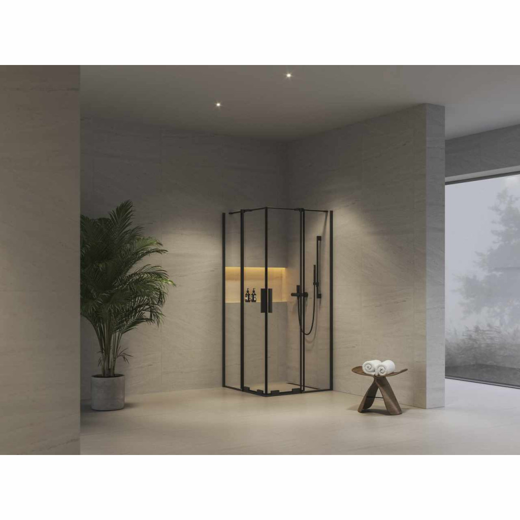 Négyrészes, sarok kialakítású Roll zuhanykabin fekete kivitelben, Ravak AntiCalc® védőréteggel ellátott, átlátszó üveg betéttel. Toló rendszerű nyitás.