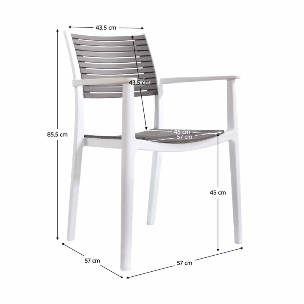 Anyag: műanyagSzín: fehér/szürke-barnaMéretek (SzxMéxMa): 58x56,5x85,5 cmÜlés magassága: 45 cmÜlés mélysége: 45 cmÜlés szélessége: 57 cmHáttámla magassága: 44,5 cmHáttámla szélessége: 43,5 cmTeherbírás: 100 kgSúly: 6,9 kgRakásolhatóAlkalmas kül- és beltéri használatraEgészben szállítva