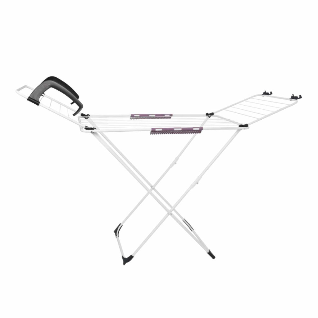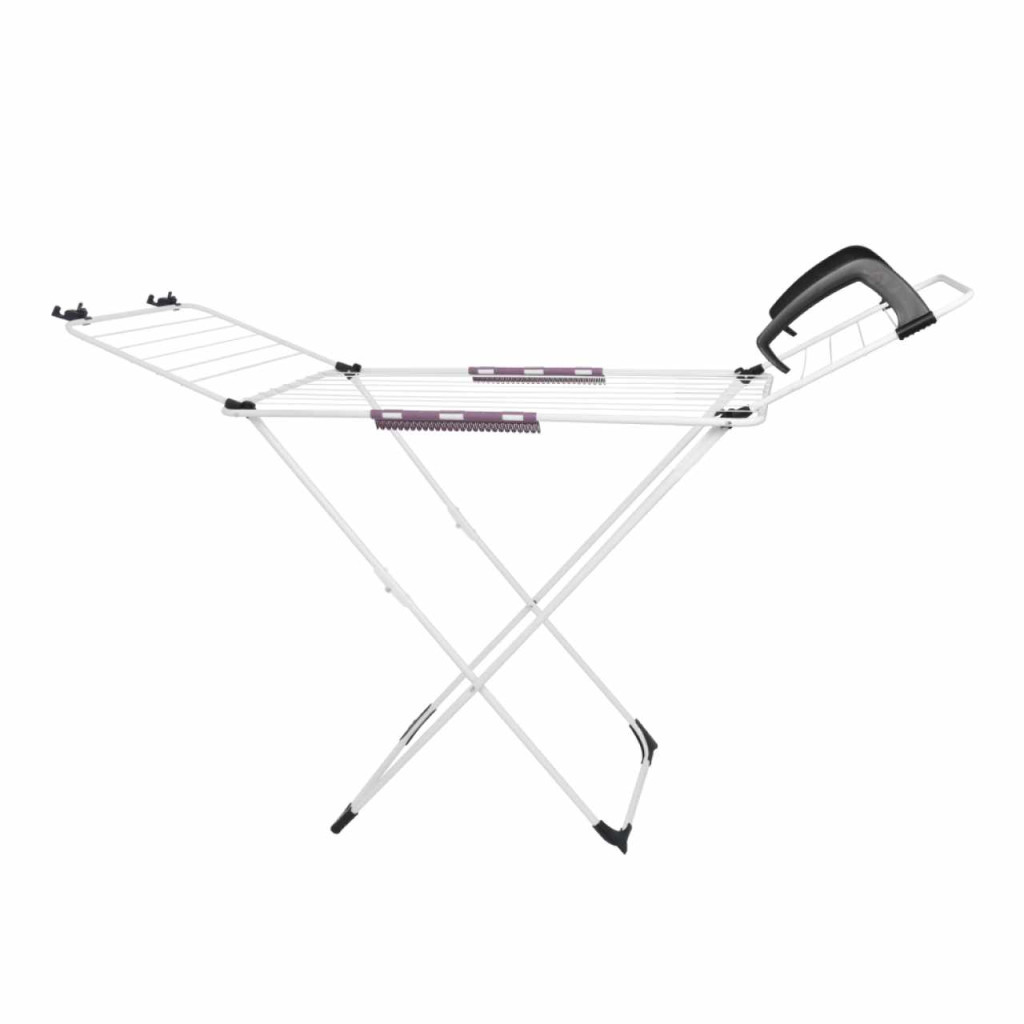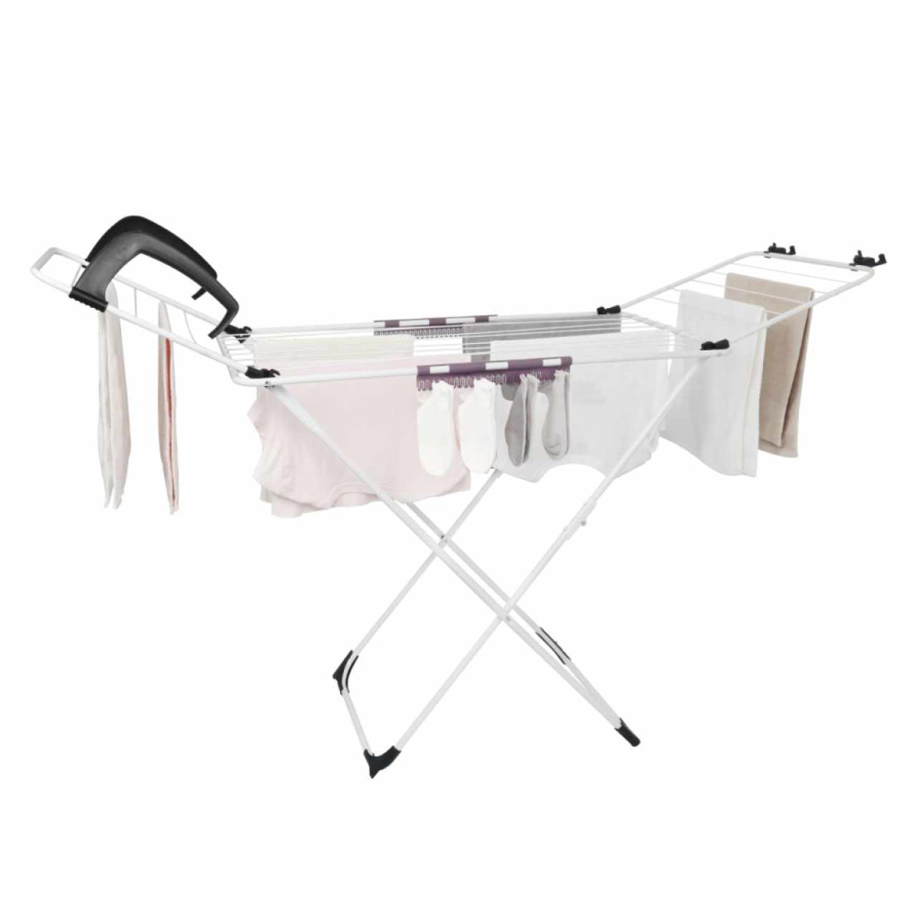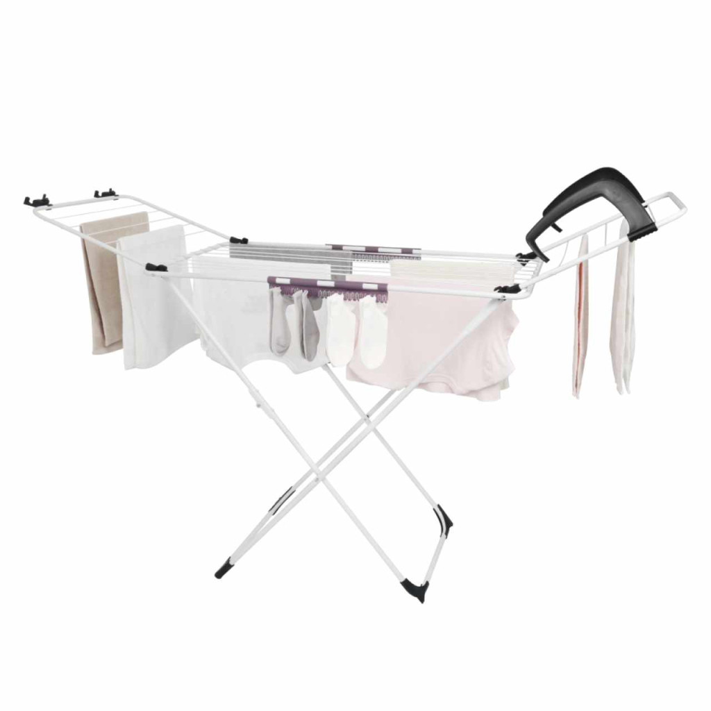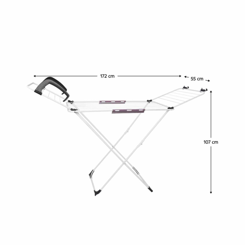 Anyag: fémSzín: fehérMéretek (SzxMéxMa): 172x55x107 cmModern dizájnKinyithatóÁlló2x easyclip apró ruhaneműk szárításáhozKibillentős oldalsó karokCsúszásgátló stabilizáló siklók