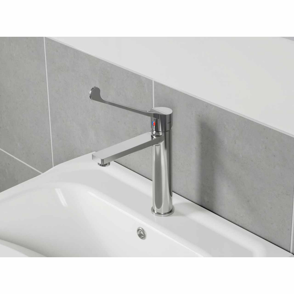 Safe álló mosdócsaptelep orvosi karral, leeresztő nélkül. Króm kivitelben.