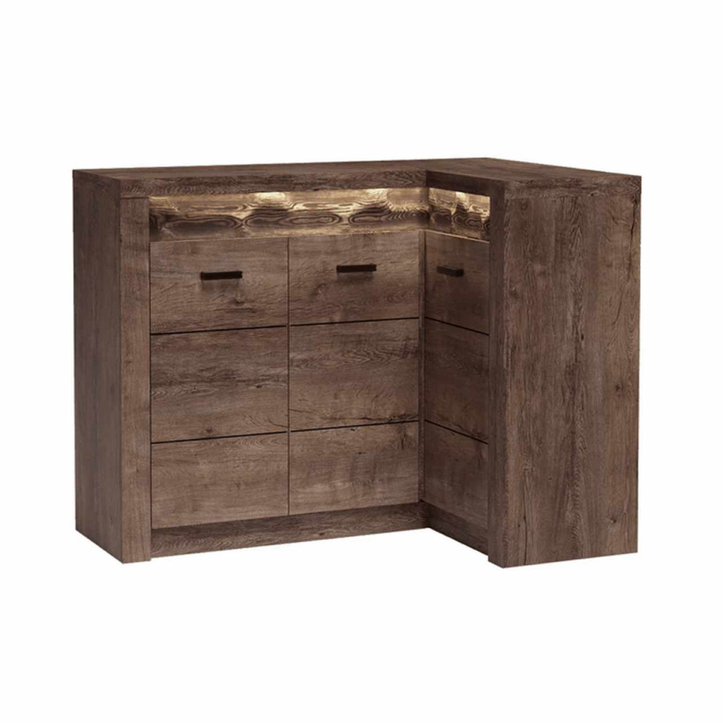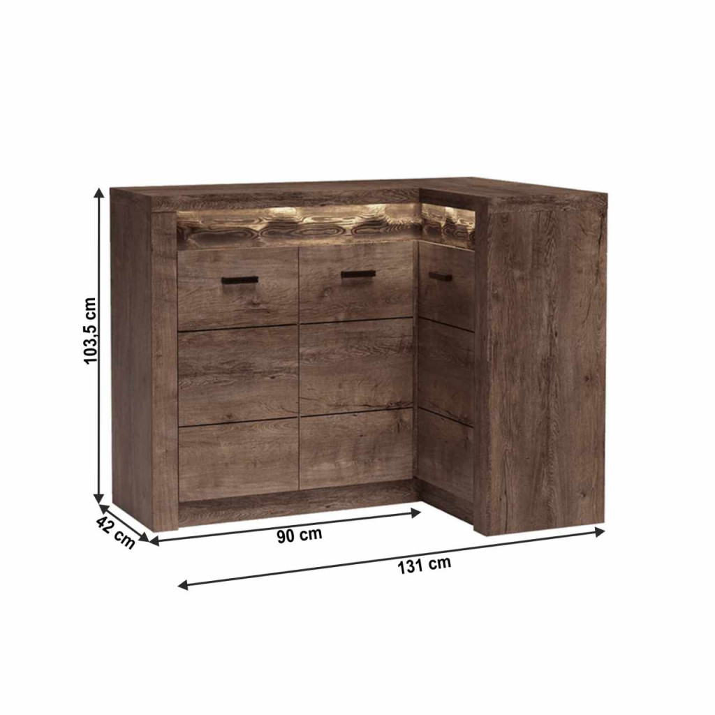 Sarokkomód INFINITY 15 Váz: 48 mm vastag Fém fogantyúk Anyag: laminált DTD, ABS élek Színváltozat: sötét kőris Méretek (SzéxMéxMa): 131/90x42x103,5 cm Szállítás szétszerelve. Szállítás LED világítás nélkül, LED világítás rendelhető hozzá.