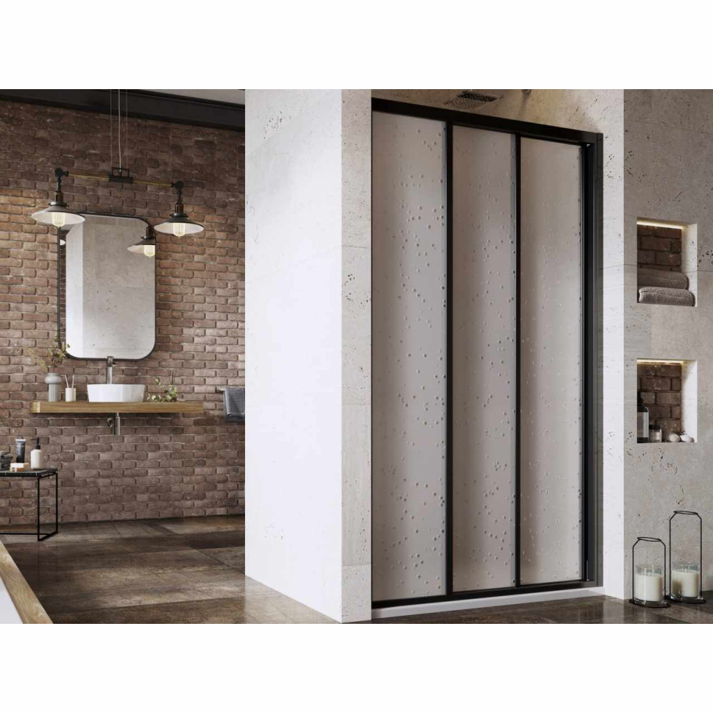 Supernova háromrészes zuhanyajtó, fekete színben, pearl műanyag betétlemezzel. A termék 180°-os megfordításával választhatunk a balos vagy jobbos változat között.