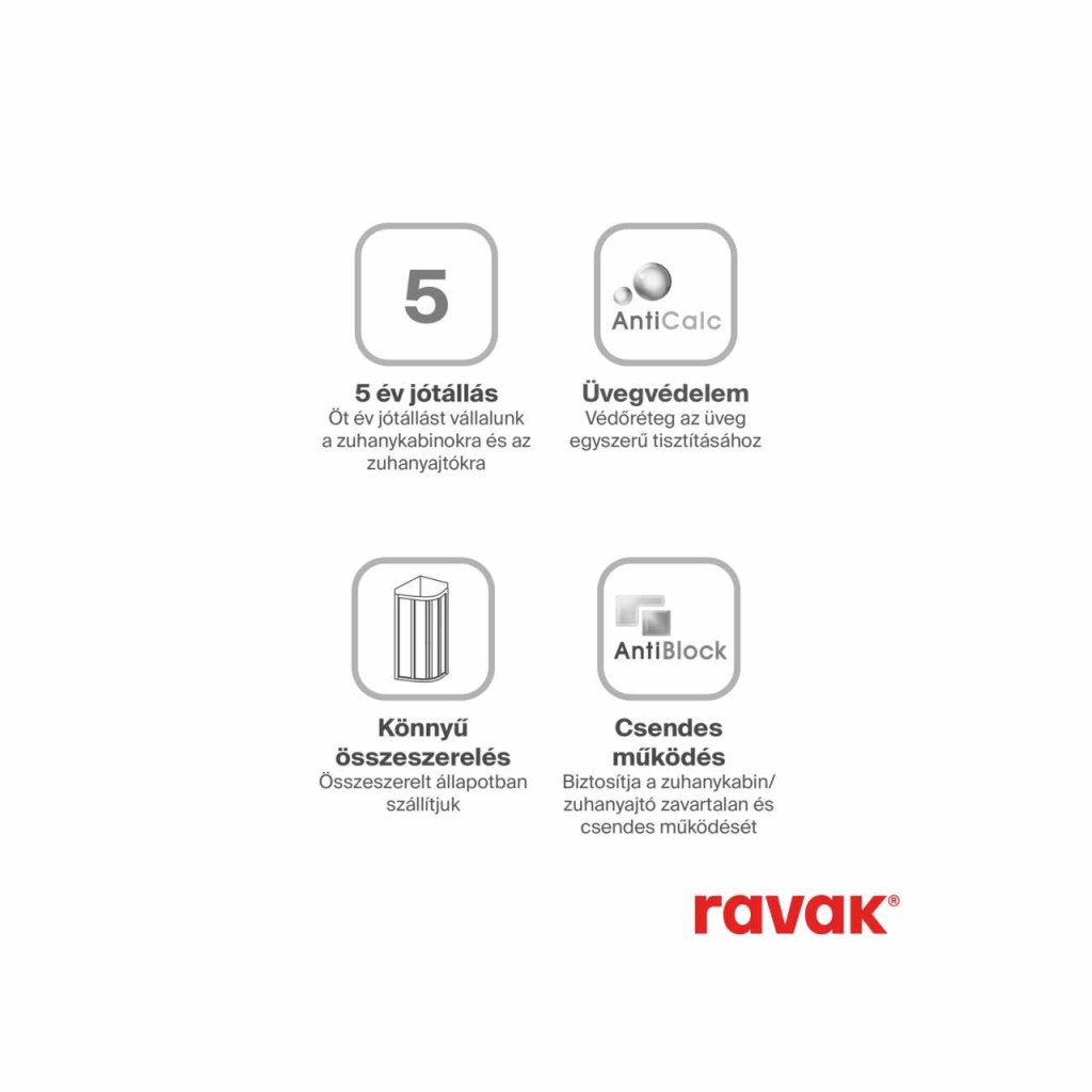 A termék két fix egyenes részből és két hajlított részből áll, mint tolóajtó. A Ravak Ronda, Elipso, Elipso Pro, Elipso Pro Chrome zuhanytálcákra vagy közvetlenül a padlóba épített zuhanyfolyókába vagy padlóösszefolyóba szerelhető.