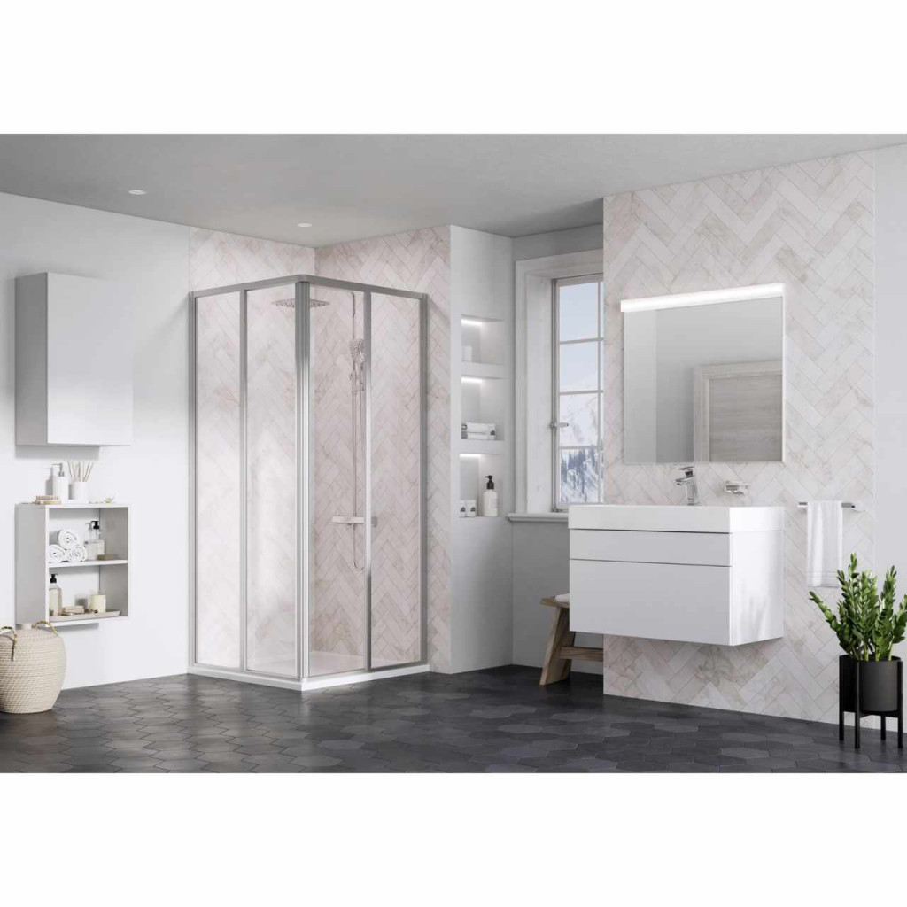 Supernova sarok zuhanykabin. Az üveget Ravak AntiCalc® védőréteg védi. Tolóajtós nyitórendszer. A termék két zuhanyajtóból áll.